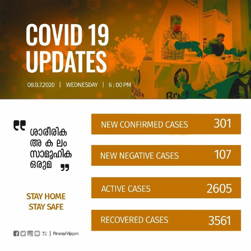 കഴിഞ്ഞ 24 മണിക്കൂറിനകം 7306 സാമ്പിളുകള് പരിശോധിച്ചു. ഇതുവരെ 4964 പേര്ക്കാണ് സംസ്ഥാനത്ത് രോഗം സ്ഥിരീകരിച്ചത്. ചികിത്സയിലുള്ളത് 2098 പേരാണ്.1,77,011 പേരാണ് നിരീക്ഷണത്തിലുള്ളത്. 2894 പേര് ആശുപത്രികളില്. ഇന്നു മാത്രം 378 പേരെ ആശുപത്രിയില് പ്രവേശിപ്പിച്ചു. ഇതുവരെ 1,91,773 സാമ്പിളുകള് ശേഖരിച്ച് പരിശോനക്ക് അയച്ചു. 4834 സാമ്പിളുകളുടെ റിസള്ട്ട് വരാനുണ്ട്.
