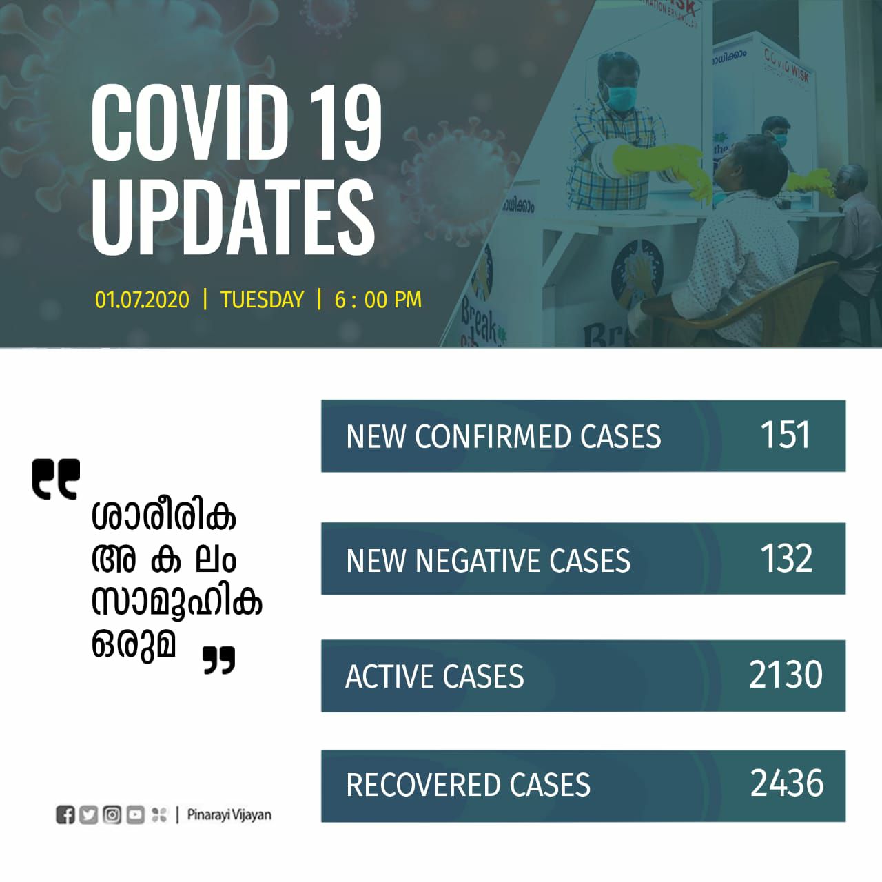 ഇന്ന് രോഗം ബാധിച്ചവരില് 86 പേര് വിദേശത്തുനിന്ന് വന്നവരാണ്. മറ്റു സംസ്ഥാനങ്ങളില്നിന്ന് 51 പേര്. സമ്പര്ക്കം 13. ജൂണ് 27ന് കോഴിക്കോട്ട് ആത്മഹത്യ ചെയ്ത നടക്കാവ് സ്വദേശി കൃഷ്ണന്റെ (68) സ്രവപരിശോധനാ ഫലം പോസിറ്റീവായിട്ടുണ്ട്.