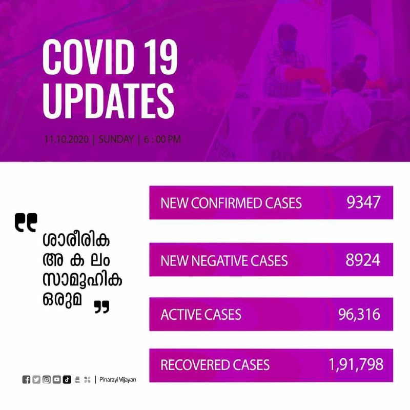 ​​സംസ്ഥാനത്ത് ഇന്ന് 9347 പേര്‍ക്ക് കോവിഡ്-19 സ്ഥിരീകരിച്ചു. മലപ്പുറം 1451, എറണാകുളം 1228, കോഴിക്കോട് 1219, തൃശൂര്‍ 960, തിരുവനന്തപുരം 797, കൊല്ലം 712, പാലക്കാട് 640, ആലപ്പുഴ 619, കോട്ടയം 417, കണ്ണൂര്‍ 413, പത്തനംതിട്ട 378, കാസര്‍ഗോഡ് 242, വയനാട് 148, ഇടുക്കി 123 എന്നിങ്ങനേയാണ് ജില്ലകളില്‍ ഇന്ന് രോഗ ബാധ സ്ഥിരീകരിച്ചത്.