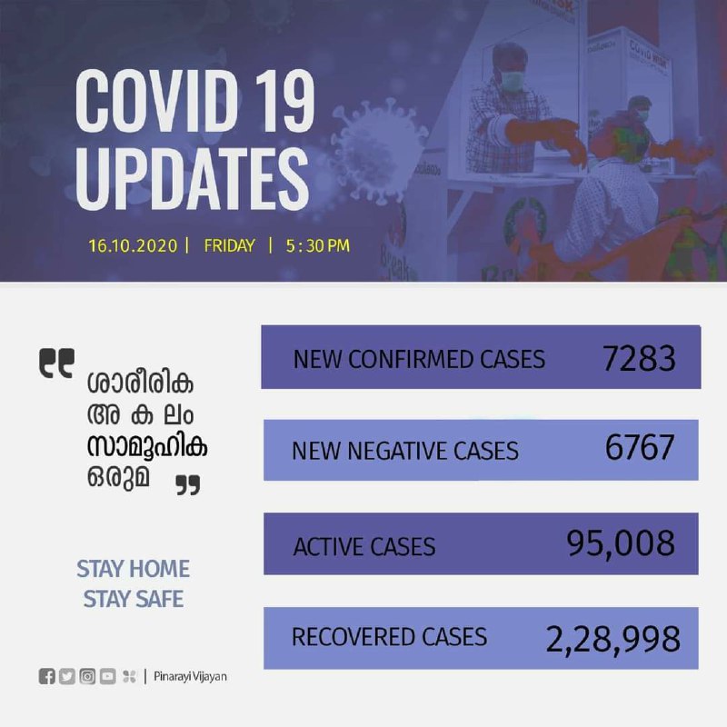 ​​ഇന്ന് 7283 പേര്‍ക്ക് സംസ്ഥാനത്ത് കോവിഡ് സ്ഥിരീകരിച്ചു. മലപ്പുറം 1025, കോഴിക്കോട് 970, തൃശൂര്‍ 809, പാലക്കാട് 648, എറണാകുളം 606, തിരുവനന്തപുരം 595, ആലപ്പുഴ 563, കോട്ടയം 432, കൊല്ലം 418, കണ്ണൂര്‍ 405, പത്തനംതിട്ട 296, കാസര്‍ഗോഡ് 234, വയനാട് 158, ഇടുക്കി 124 എന്നിങ്ങനേയാണ് ജില്ലകളില്‍ ഇന്ന് രോഗ ബാധ സ്ഥിരീകരിച്ചത്.