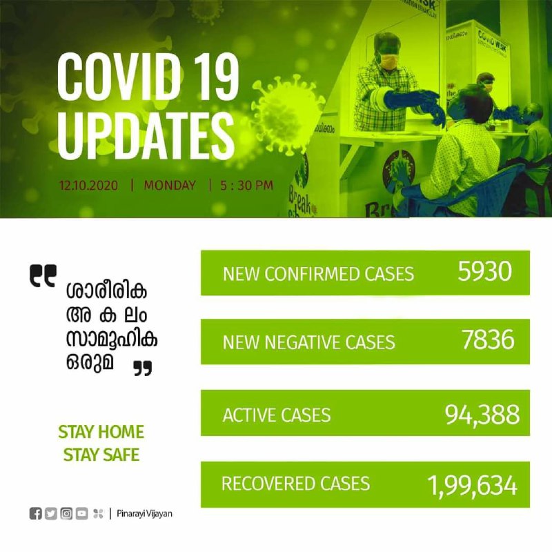​​സംസ്ഥാനത്ത് ഇന്ന് 5930 പേര്‍ക്ക് കോവിഡ്-19 സ്ഥിരീകരിച്ചു. കോഴിക്കോട് 869, മലപ്പുറം 740, തൃശൂര്‍ 697, തിരുവനന്തപുരം 629, ആലപ്പുഴ 618, എറണാകുളം 480, കോട്ടയം 382, കൊല്ലം 343, കാസര്‍ഗോഡ് 295, പാലക്കാട് 288, കണ്ണൂര്‍ 274, പത്തനംതിട്ട 186, ഇടുക്കി 94, വയനാട് 35 എന്നിങ്ങനേയാണ് ജില്ലകളില്‍ ഇന്ന് രോഗ ബാധ സ്ഥിരീകരിച്ചത്.