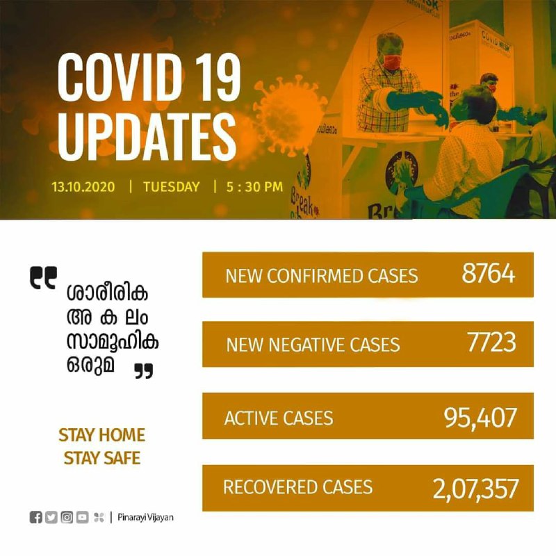 ഇന്ന് രോഗം സ്ഥിരീകരിച്ചവരില്‍ 36 പേര്‍ വിദേശ രാജ്യങ്ങളില്‍ നിന്നും 85 പേര്‍ മറ്റ് സംസ്ഥാനങ്ങളില്‍ നിന്നും വന്നതാണ്. 8039 പേര്‍ക്ക് സമ്പര്‍ക്കത്തിലൂടെയാണ് രോഗം ബാധിച്ചത്. 528 പേരുടെ സമ്പര്‍ക്ക ഉറവിടം വ്യക്തമല്ല. മലപ്പുറം 1040, എറണാകുളം 949, കോഴിക്കോട് 1049, തൃശൂര്‍ 950, കൊല്ലം 862, തിരുവനന്തപുരം 680, പാലക്കാട് 575, ആലപ്പുഴ 459, കോട്ടയം 435, കണ്ണൂര്‍ 333, കാസര്‍ഗോഡ് 308, പത്തനംതിട്ട 224, വയനാട് 104, ഇടുക്കി 71 എന്നിങ്ങനേയാണ് സമ്പര്‍ക്കത്തിലൂടെ രോഗം ബാധിച്ചത്