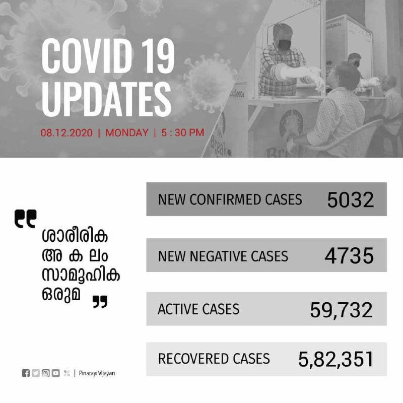 ​​സംസ്ഥാനത്ത് ഇന്ന് 5032 പേര്‍ക്ക് കോവിഡ്-19 സ്ഥിരീകരിച്ചു. കോട്ടയം 695, മലപ്പുറം 694, തൃശൂര്‍ 625, എറണാകുളം 528, കോഴിക്കോട് 451, പാലക്കാട് 328, കൊല്ലം 317, വയനാട് 284, തിരുവനന്തപുരം 272, ആലപ്പുഴ 241, പത്തനംതിട്ട 238, കണ്ണൂര്‍ 207, കാസര്‍ഗോഡ് 79, ഇടുക്കി 73 എന്നിങ്ങനേയാണ് ജില്ലകളില്‍ ഇന്ന് രോഗ ബാധ സ്ഥിരീകരിച്ചത്.