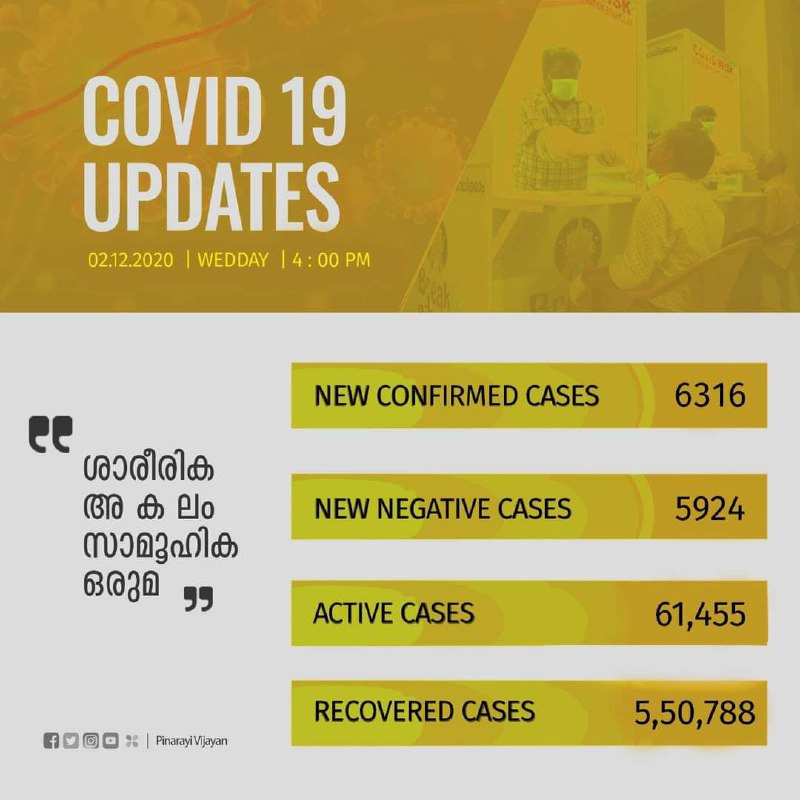 ​​കേരളത്തില്‍ ഇന്ന് 6316 പേര്‍ക്ക് കോവിഡ്-19 സ്ഥിരീകരിച്ചു. മലപ്പുറം 822, കോഴിക്കോട് 734, എറണാകുളം 732, തൃശൂര്‍ 655, കോട്ടയം 537, തിരുവനന്തപുരം 523, ആലപ്പുഴ 437, പാലക്കാട് 427, കൊല്ലം 366, പത്തനംതിട്ട 299, വയനാട് 275, കണ്ണൂര്‍ 201, ഇടുക്കി 200, കാസര്‍ഗോഡ് 108 എന്നിങ്ങനേയാണ് ജില്ലകളില്‍ ഇന്ന് രോഗ ബാധ സ്ഥിരീകരിച്ചത്.