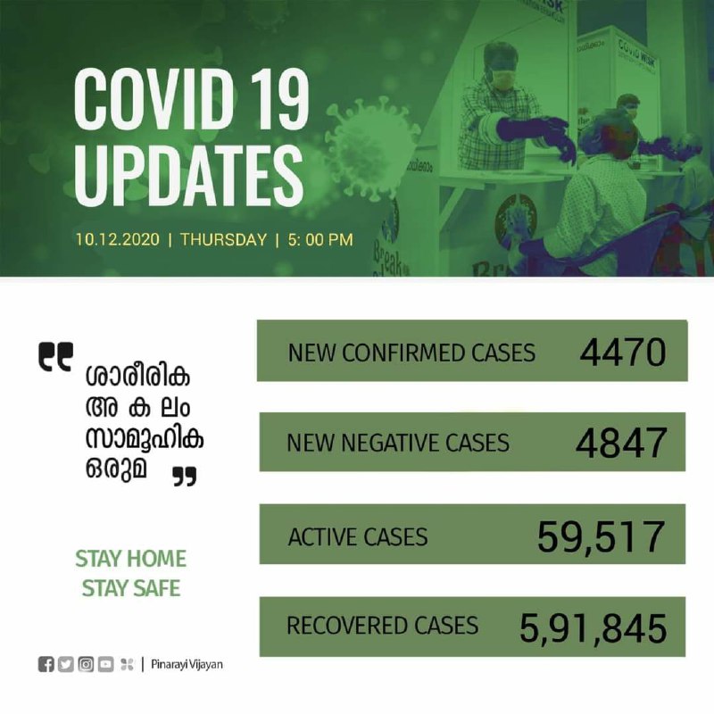 ​​സംസ്ഥാനത്ത് ഇന്ന് 4470 പേര്‍ക്ക് കോവിഡ്-19 സ്ഥിരീകരിച്ചു. മലപ്പുറം 700, കോഴിക്കോട് 578, എറണാകുളം 555, തൃശൂര്‍ 393, കോട്ടയം 346, കൊല്ലം 305, ആലപ്പുഴ 289, തിരുവനന്തപുരം 282, പാലക്കാട് 212, ഇടുക്കി 200, പത്തനംതിട്ട 200, കണ്ണൂര്‍ 186, വയനാട് 114, കാസര്‍ഗോഡ് 110 എന്നിങ്ങനേയാണ് ജില്ലകളില്‍ ഇന്ന് രോഗ ബാധ സ്ഥിരീകരിച്ചത്.
