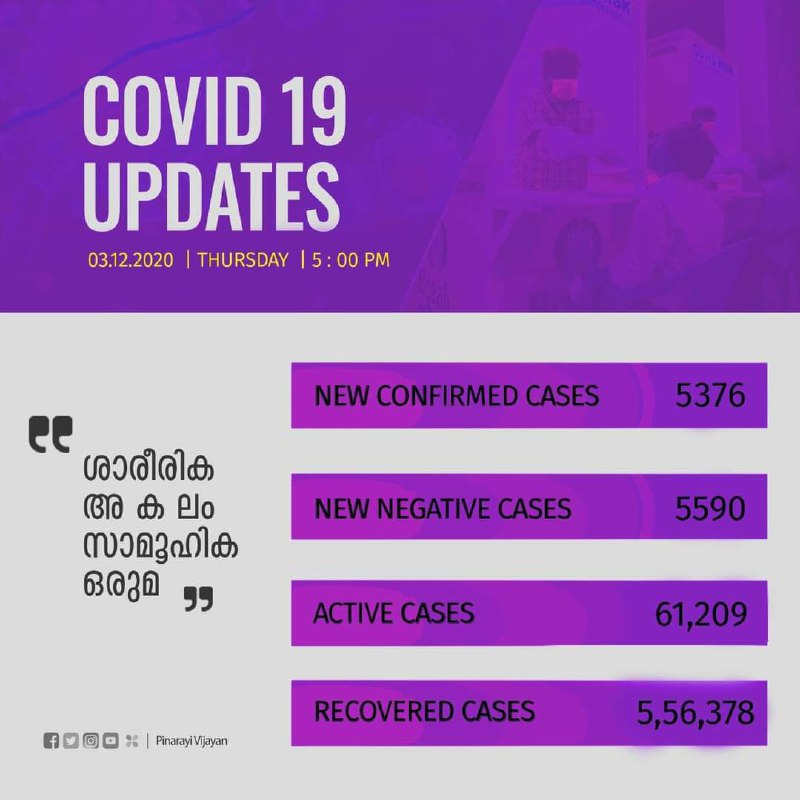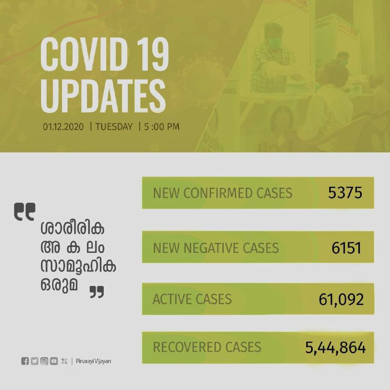 ​​കേരളത്തില്‍ ഇന്ന് 5376 പേര്‍ക്ക് കോവിഡ്-19 സ്ഥിരീകരിച്ചു. മലപ്പുറം 714, തൃശൂര്‍ 647, കോഴിക്കോട് 547, എറണാകുളം 441, തിരുവനന്തപുരം 424, ആലപ്പുഴ 408, പാലക്കാട് 375, കോട്ടയം 337, പത്തനംതിട്ട 317, കണ്ണൂര്‍ 288, കൊല്ലം 285, ഇടുക്കി 265, വയനാട് 238, കാസര്‍ഗോഡ് 90 എന്നിങ്ങനേയാണ് ജില്ലകളില്‍ ഇന്ന് രോഗ ബാധ സ്ഥിരീകരിച്ചത്.