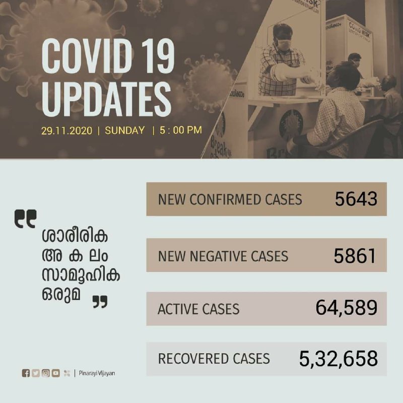 ഇന്ന് രോഗം സ്ഥിരീകരിച്ചവരില്‍ 87 പേര്‍ സംസ്ഥാനത്തിന് പുറത്ത് നിന്നും വന്നവരാണ്. 4951 പേര്‍ക്ക് സമ്പര്‍ക്കത്തിലൂടെയാണ് രോഗം ബാധിച്ചത്. 571 പേരുടെ സമ്പര്‍ക്ക ഉറവിടം വ്യക്തമല്ല. കോഴിക്കോട് 801, മലപ്പുറം 688, തൃശൂര്‍ 513, എറണാകുളം 374, കൊല്ലം 424, കോട്ടയം 392, പാലക്കാട് 229, ആലപ്പുഴ 376, തിരുവനന്തപുരം 244, കണ്ണൂര്‍ 247, ഇടുക്കി 244, പത്തനംതിട്ട 173, വയനാട് 134, കാസര്‍ഗോഡ് 112 എന്നിങ്ങനേയാണ് സമ്പര്‍ക്കത്തിലൂടെ രോഗം ബാധിച്ചത്.