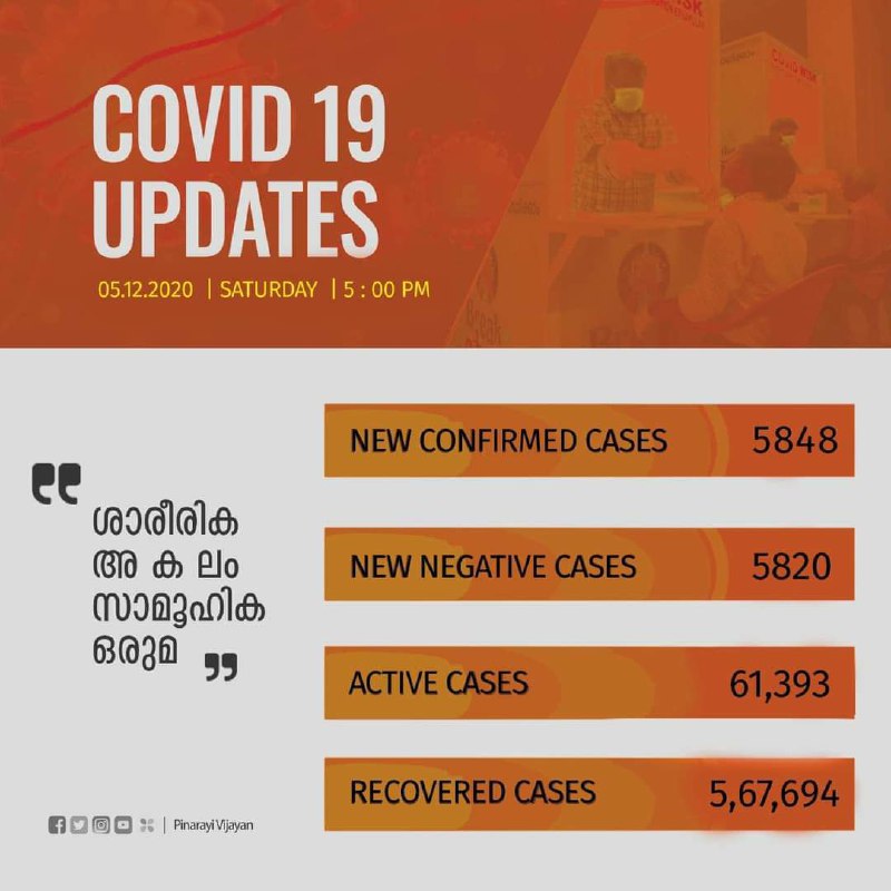 ​​സംസ്ഥാനത്ത് ഇന്ന് 5848 പേര്‍ക്ക് കോവിഡ്-19 സ്ഥിരീകരിച്ചു. മലപ്പുറം 920, കോഴിക്കോട് 688, എറണാകുളം 655, കോട്ടയം 567, തൃശൂര്‍ 536, കൊല്ലം 405, പാലക്കാട് 399, ആലപ്പുഴ 365, തിരുവനന്തപുരം 288, കണ്ണൂര്‍ 280, വയനാട് 258, പത്തനംതിട്ട 208, ഇടുക്കി 157, കാസര്‍ഗോഡ് 112 എന്നിങ്ങനേയാണ് ജില്ലകളില്‍ ഇന്ന് രോഗ ബാധ സ്ഥിരീകരിച്ചത്.