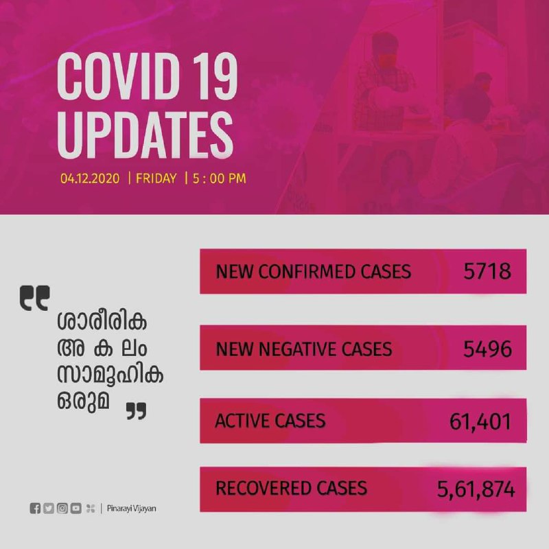 രോഗം സ്ഥിരീകരിച്ച് ചികിത്സയിലായിരുന്ന 5496 പേരുടെ പരിശോധനാഫലം നെഗറ്റീവ് ആയി. തിരുവനന്തപുരം 451, കൊല്ലം 662, പത്തനംതിട്ട 130, ആലപ്പുഴ 548, കോട്ടയം 500, ഇടുക്കി 109, എറണാകുളം 440, തൃശൂര്‍ 377, പാലക്കാട് 444, മലപ്പുറം 796, കോഴിക്കോട് 554, വയനാട് 139, കണ്ണൂര്‍ 276, കാസര്‍ഗോഡ് 70 എന്നിങ്ങനേയാണ് പരിശോധനാ ഫലം ഇന്ന് നെഗറ്റീവായത്. ഇതോടെ 61,401 പേരാണ് രോഗം സ്ഥിരീകരിച്ച് ഇനി ചികിത്സയിലുള്ളത്. 5,61,874 പേര്‍ ഇതുവരെ കോവിഡില്‍ നിന്നും മുക്തി നേടി.
