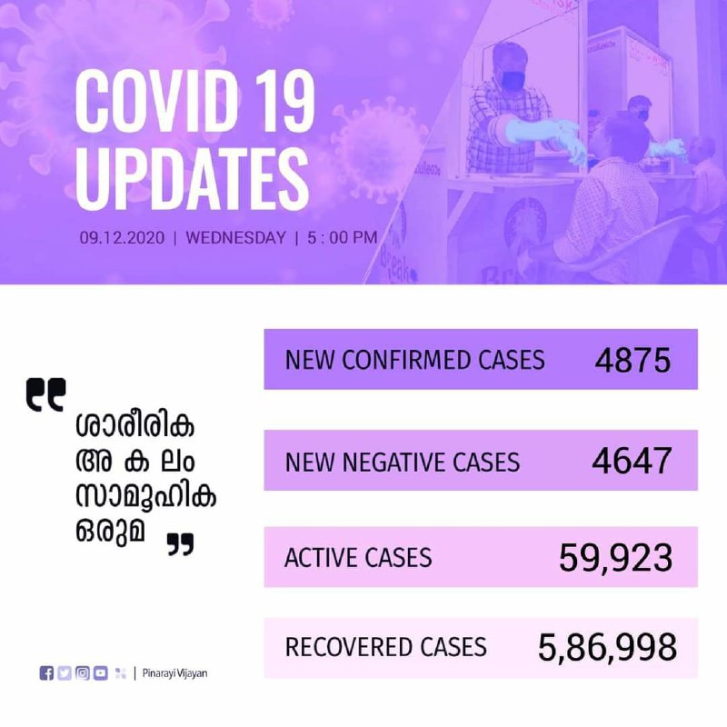 ​​സംസ്ഥാനത്ത് ഇന്ന് 4875 പേര്‍ക്ക് കോവിഡ്-19 സ്ഥിരീകരിച്ചു. എറണാകുളം 717, മലപ്പുറം 709, കോഴിക്കോട് 656, തൃശൂര്‍ 511, കോട്ടയം 497, പാലക്കാട് 343, പത്തനംതിട്ട 254, കണ്ണൂര്‍ 251, വയനാട് 241, കൊല്ലം 212, ആലപ്പുഴ 194, തിരുവനന്തപുരം 181, ഇടുക്കി 57, കാസര്‍ഗോഡ് 52 എന്നിങ്ങനേയാണ് ജില്ലകളില്‍ ഇന്ന് രോഗ ബാധ സ്ഥിരീകരിച്ചത്.