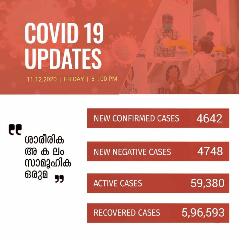 രോഗം സ്ഥിരീകരിച്ച് ചികിത്സയിലായിരുന്ന 4647 പേരുടെ പരിശോധനാഫലം നെഗറ്റീവ് ആയി. തിരുവനന്തപുരം 401, കൊല്ലം 281, പത്തനംതിട്ട 182, ആലപ്പുഴ 363, കോട്ടയം 311, ഇടുക്കി 56, എറണാകുളം 532, തൃശൂര്‍ 470, പാലക്കാട് 437, മലപ്പുറം 612, കോഴിക്കോട് 610, വയനാട് 111, കണ്ണൂര്‍ 217, കാസര്‍ഗോഡ് 64 എന്നിങ്ങനേയാണ് പരിശോധനാ ഫലം ഇന്ന് നെഗറ്റീവായത്. ഇതോടെ 59,923 പേരാണ് രോഗം സ്ഥിരീകരിച്ച് ഇനി ചികിത്സയിലുള്ളത്. 5,86,998 പേര്‍ ഇതുവരെ കോവിഡില്‍ നിന്നും മുക്തി നേടി.