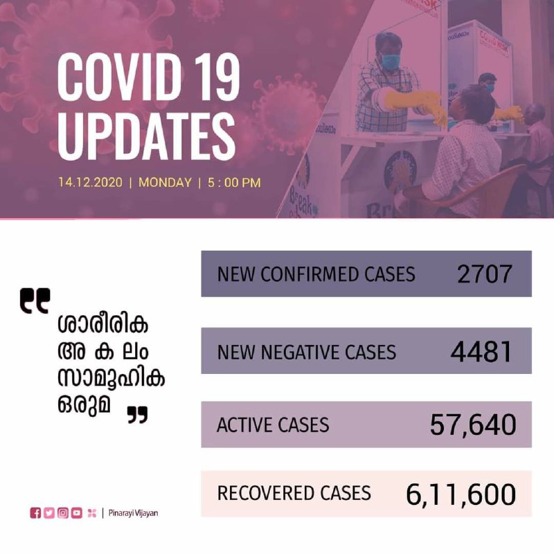 ​​സംസ്ഥാനത്ത് ഇന്ന് 2707 പേര്‍ക്ക് കോവിഡ്-19 സ്ഥിരീകരിച്ചു. മലപ്പുറം 441, എറണാകുളം 343, തൃശൂര്‍ 268, കോട്ടയം 252, തിരുവനന്തപുരം 222, ആലപ്പുഴ 220, കോഴിക്കോട് 219, പാലക്കാട് 190, കൊല്ലം 160, കണ്ണൂര്‍ 136, പത്തനംതിട്ട 133, വയനാട് 61, ഇടുക്കി 47, കാസര്‍ഗോഡ് 15 എന്നിങ്ങനേയാണ് ജില്ലകളില്‍ ഇന്ന് രോഗ ബാധ സ്ഥിരീകരിച്ചത്.