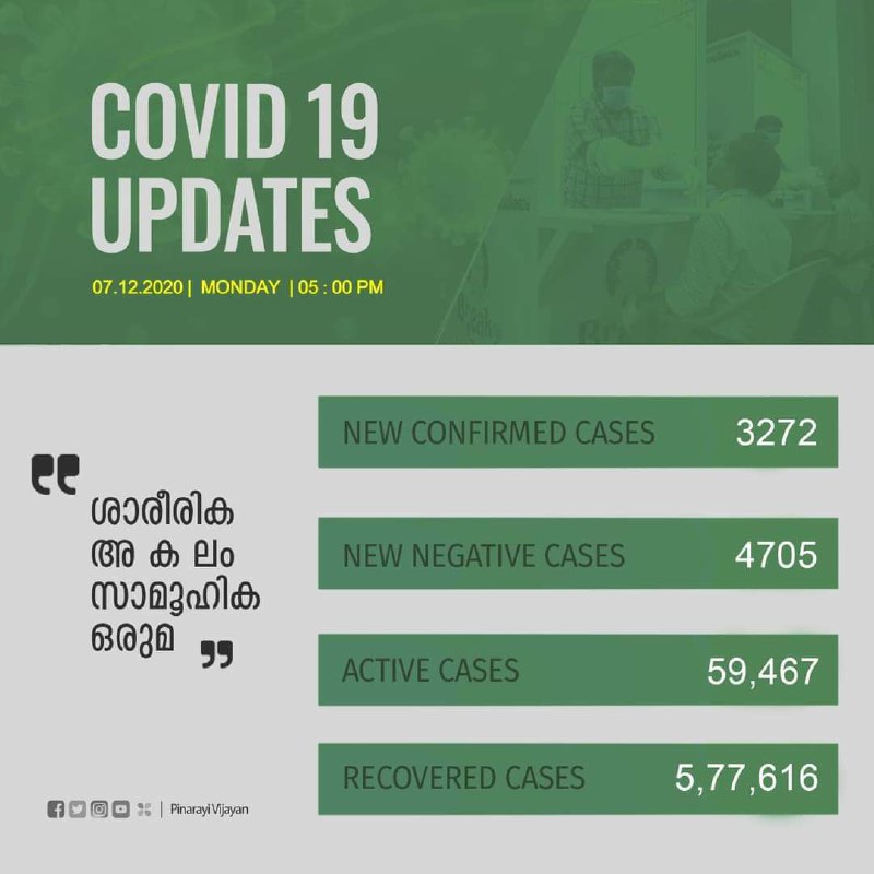 ​​സംസ്ഥാനത്ത് ഇന്ന് 3272 പേര്‍ക്ക് കോവിഡ്-19 സ്ഥിരീകരിച്ചു. മലപ്പുറം 541, കോഴിക്കോട് 383, തൃശൂര്‍ 304, കൊല്ലം 292, ആലപ്പുഴ 287, എറണാകുളം 278, തിരുവനന്തപുരം 255, കോട്ടയം 202, പാലക്കാട് 202, കണ്ണൂര്‍ 154, ഇടുക്കി 146, പത്തനംതിട്ട 121, വയനാട് 63, കാസര്‍ഗോഡ് 44 എന്നിങ്ങനേയാണ് ജില്ലകളില്‍ ഇന്ന് രോഗ ബാധ സ്ഥിരീകരിച്ചത്.