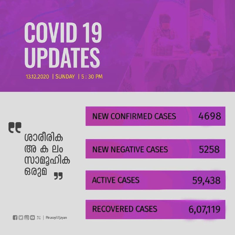 രോഗം സ്ഥിരീകരിച്ച് ചികിത്സയിലായിരുന്ന 4705 പേരുടെ പരിശോധനാഫലം നെഗറ്റീവ് ആയി. തിരുവനന്തപുരം 297, കൊല്ലം 329, പത്തനംതിട്ട 171, ആലപ്പുഴ 312, കോട്ടയം 354, ഇടുക്കി 119, എറണാകുളം 354, തൃശൂര്‍ 563, പാലക്കാട് 323, മലപ്പുറം 864, കോഴിക്കോട് 571, വയനാട് 150, കണ്ണൂര്‍ 234, കാസര്‍ഗോഡ് 64 എന്നിങ്ങനേയാണ് പരിശോധനാ ഫലം ഇന്ന് നെഗറ്റീവായത്. ഇതോടെ 59,467 പേരാണ് രോഗം സ്ഥിരീകരിച്ച് ഇനി ചികിത്സയിലുള്ളത്. 5,77,616 പേര്‍ ഇതുവരെ കോവിഡില്‍ നിന്നും മുക്തി നേടി.