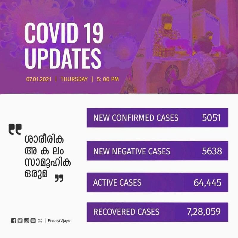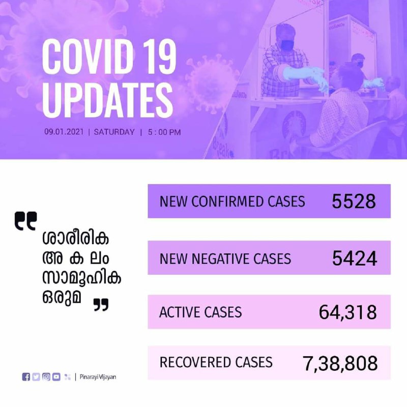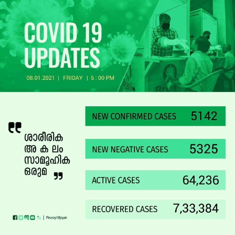 രോഗം സ്ഥിരീകരിച്ച് ചികിത്സയിലായിരുന്ന 5325 പേരുടെ പരിശോധനാഫലം നെഗറ്റീവ് ആയി. തിരുവനന്തപുരം 307, കൊല്ലം 323, പത്തനംതിട്ട 728, ആലപ്പുഴ 366, കോട്ടയം 545, ഇടുക്കി 99, എറണാകുളം 686, തൃശൂര്‍ 366, പാലക്കാട് 207, മലപ്പുറം 569, കോഴിക്കോട് 574, വയനാട് 126, കണ്ണൂര്‍ 318, കാസര്‍ഗോഡ് 111 എന്നിങ്ങനേയാണ് പരിശോധനാ ഫലം ഇന്ന് നെഗറ്റീവായത്. ഇതോടെ 64,236 പേരാണ് രോഗം സ്ഥിരീകരിച്ച് ഇനി ചികിത്സയിലുള്ളത്. 7,33,384 പേര്‍ ഇതുവരെ കോവിഡില്‍ നിന്നും മുക്തി നേടി.