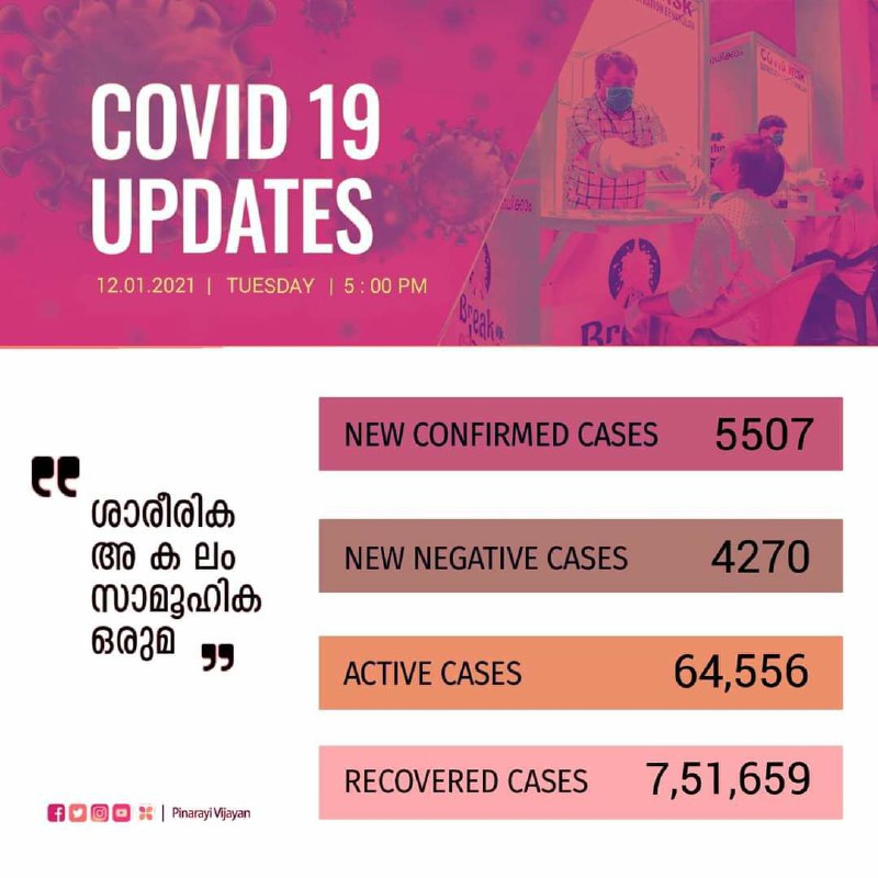 ​​സംസ്ഥാനത്ത് ഇന്ന് 5507 പേര്‍ക്ക് കോവിഡ്-19 സ്ഥിരീകരിച്ചു. എറണാകുളം 813, കോട്ടയം 709, കോഴിക്കോട് 566, പത്തനംതിട്ട 482, തൃശൂര്‍ 479, കൊല്ലം 447, മലപ്പുറം 400, തിരുവനന്തപുരം 350, ആലപ്പുഴ 349, കണ്ണൂര്‍ 273, വയനാട് 207, പാലക്കാട് 201, ഇടുക്കി 173, കാസര്‍ഗോഡ് 58 എന്നിങ്ങനേയാണ് ജില്ലകളില്‍ ഇന്ന് രോഗ ബാധ സ്ഥിരീകരിച്ചത്.