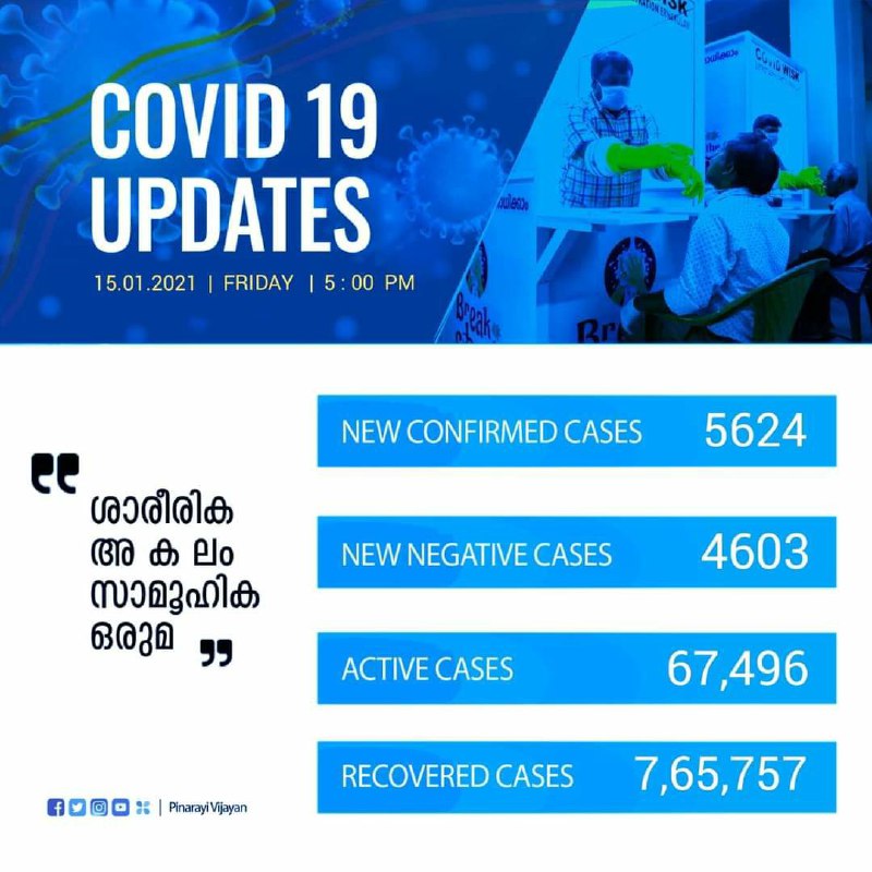 രോഗം സ്ഥിരീകരിച്ച് ചികിത്സയിലായിരുന്ന 5638 പേരുടെ പരിശോധനാഫലം നെഗറ്റീവ് ആയി. തിരുവനന്തപുരം 340, കൊല്ലം 270, പത്തനംതിട്ട 545, ആലപ്പുഴ 485, കോട്ടയം 349, ഇടുക്കി 65, എറണാകുളം 1102, തൃശൂര്‍ 395, പാലക്കാട് 210, മലപ്പുറം 545, കോഴിക്കോട് 517, വയനാട് 256, കണ്ണൂര്‍ 458, കാസര്‍ഗോഡ് 101 എന്നിങ്ങനേയാണ് പരിശോധനാ ഫലം ഇന്ന് നെഗറ്റീവായത്. ഇതോടെ 64,445 പേരാണ് രോഗം സ്ഥിരീകരിച്ച് ഇനി ചികിത്സയിലുള്ളത്. 7,28,060 പേര്‍ ഇതുവരെ കോവിഡില്‍ നിന്നും മുക്തി നേടി.