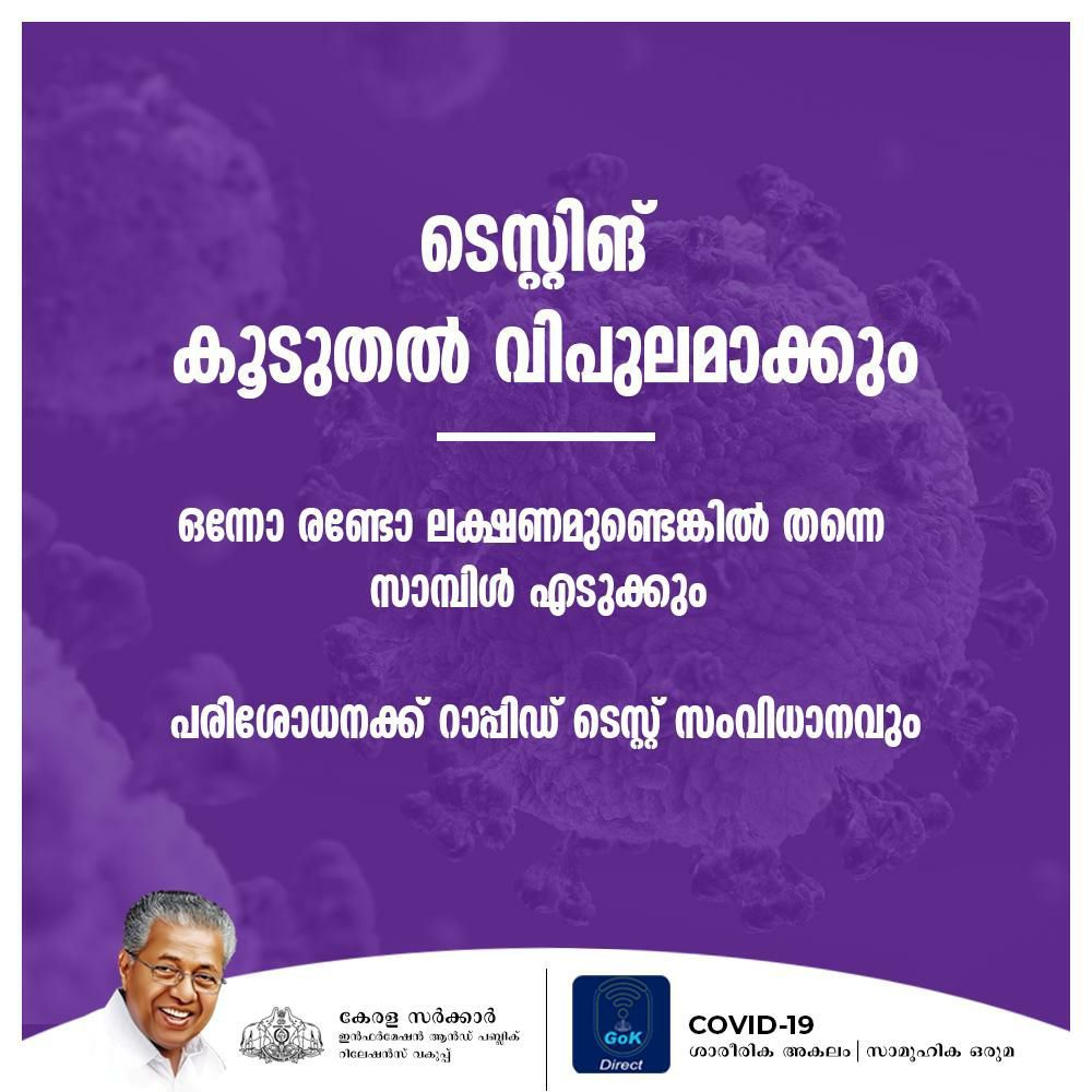 ടെസ്റ്റിങ് കൂടുതല് വിപുലവും വ്യാപകവുമാക്കാനാണ് തീരുമാനം. ഇപ്പോള് കൂടുതൽ രോഗലക്ഷണങ്ങള് ഉള്ളവരുടെ സാമ്പിളുകളാണ് എടുക്കുന്നത്. ഒന്നോ രണ്ടോ ലക്ഷണമുണ്ടെങ്കില് തന്നെ സാമ്പിള് എടുക്കുകയും പരിശോധിക്കുകയും ചെയ്യും. റാപ്പിഡ് ടെസ്റ്റ് സംവിധാനമടക്കം പരിശോധനയ്ക്ക് ഉപയോഗിക്കും.