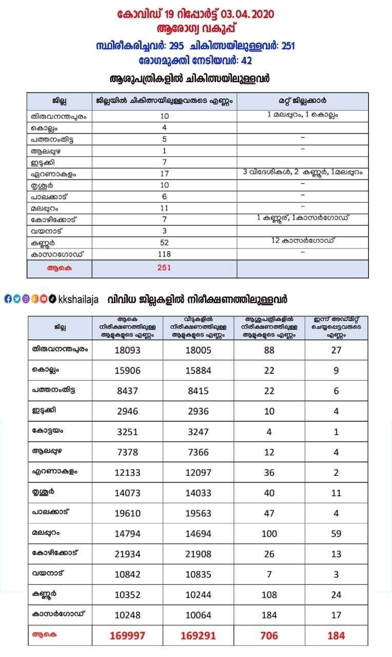 കേരളത്തില് 295 പേര്ക്കാണ് ഇതുവരെ രോഗബാധ സ്ഥിരീകരിച്ചത്. 14 പേരുടെ പരിശോധനാഫലം ഇന്ന് നെഗറ്റീവ് ആയി. കണ്ണൂര് ജില്ലയില് ചികിത്സയിലായിരുന്ന 5 പേരുടെയും കാസര്ഗോഡ് ജില്ലയില് നിന്നും 3 പേരുടെയും ഇടുക്കി ജില്ലയില് നിന്നും 2 പേരുടെയും കോഴിക്കോട് ജില്ലയില് നിന്നും 2 പേരുടെയും (കാസര്ഗോഡ് ജില്ലയില് നിന്നുള്ള ഒരാള്) പത്തനംതിട്ട, കോട്ടയം ജില്ലകളില് നിന്നും ഓരോരുത്തരുടേയും പരിശോധനാഫലം നെഗറ്റീവ് ആണ്. കോട്ടയത്തെ വൃദ്ധ ദമ്പതികളും അവരെ ശുശ്രൂഷിച്ച നഴ്സും രോഗം ഭേദമായതിനെത്തുടര്ന്ന് ആശുപത്രി വിട്ടു. നിലവില് 251 പേരാണ് സംസ്ഥാനത്തെ വിവിധ ആശുപത്രികളില് ചികിത്സയിലുള്ളത്. 42 പേര് രോഗമുക്തി നേടി ഡിസ്ചാര്ജായി. രണ്ട് പേര് മുമ്പ് മരണമടഞ്ഞിരുന്നു.