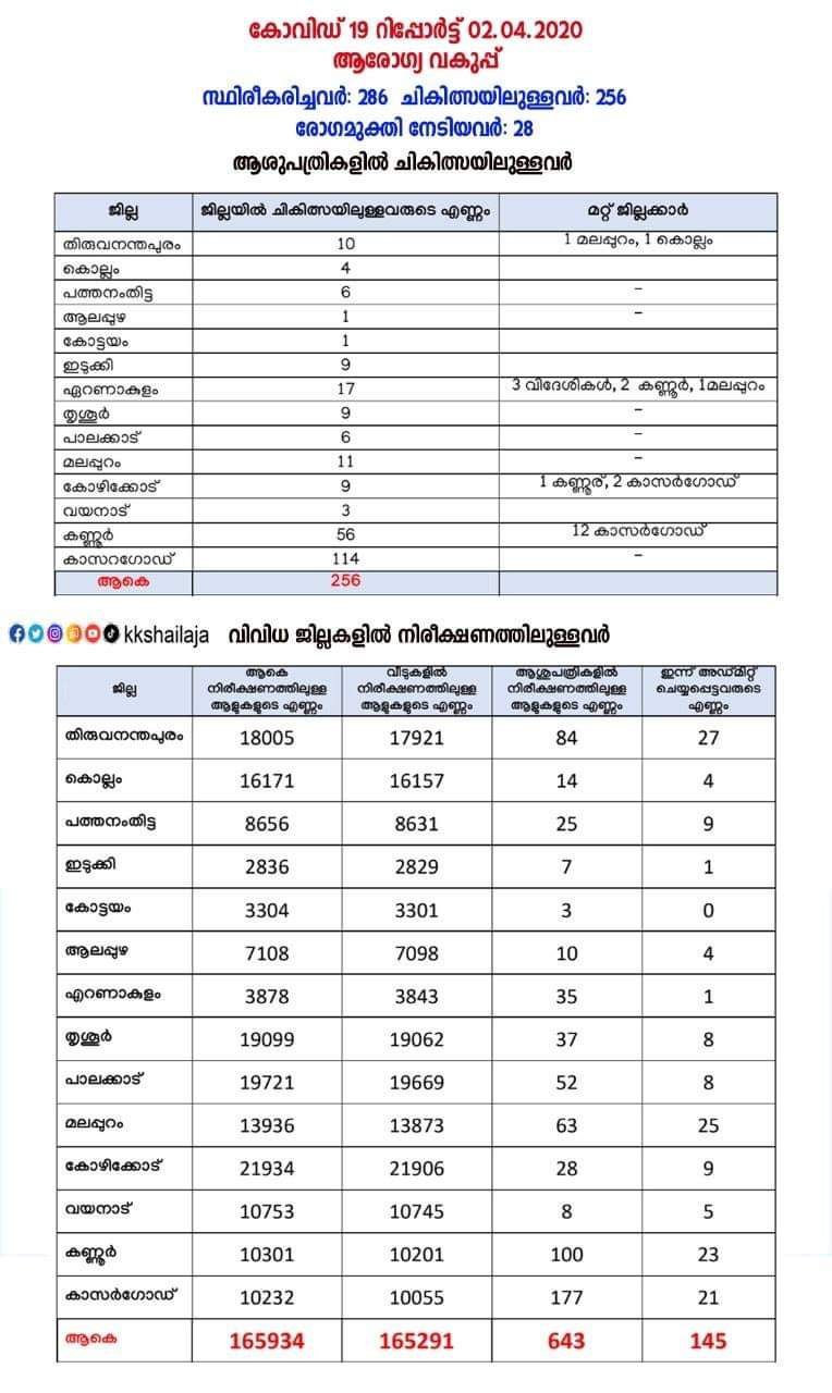 കേരളത്തില് 286 പേര്ക്കാണ് ഇതുവരെ രോഗബാധ സ്ഥിരീകരിച്ചത്. നിലവില് 256 പേരാണ് സംസ്ഥാനത്തെ വിവിധ ആശുപത്രികളില് ചികിത്സയിലുള്ളത്. ഇന്ന് കേരളത്തില് 2 പേരുടെ പരിശോധനാഫലം നെഗറ്റീവ് ആയിട്ടുണ്ട്. തിരുവനന്തപുരം, മലപ്പുറം ജില്ലകളില് ചികിത്സയിലായിരുന്ന ഓരോരുത്തരുടെ വീതം പരിശോധനാ ഫലമാണ് നെഗറ്റീവ് ആയത്. 28 പേര് രോഗമുക്തി നേടി ഡിസ്ചാര്ജായി. രണ്ട് പേര് മുമ്പ് മരണമടഞ്ഞിരുന്നു.