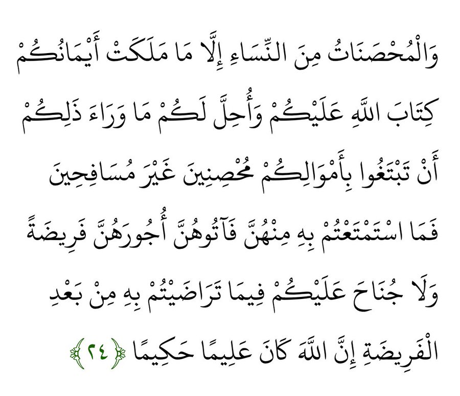 «و [نکاح/تجاوز به] زنان شوهردار [بر شما حرام شده است] مگر زنانی که [به سبب جنگ با شوهرانِ کافرشان از راه اسارت] مالک آنها شدهاید؛ [این احکام] را خدا بر شما مقرر کرده.…».