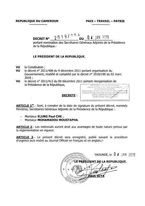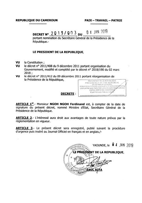 Article 1er. Monsieur NGOH NGOH Ferdinand est, à compter de la date de signature du présent décret, nommé ministre d'Etat, Secrétaire général de la présidence de la République.