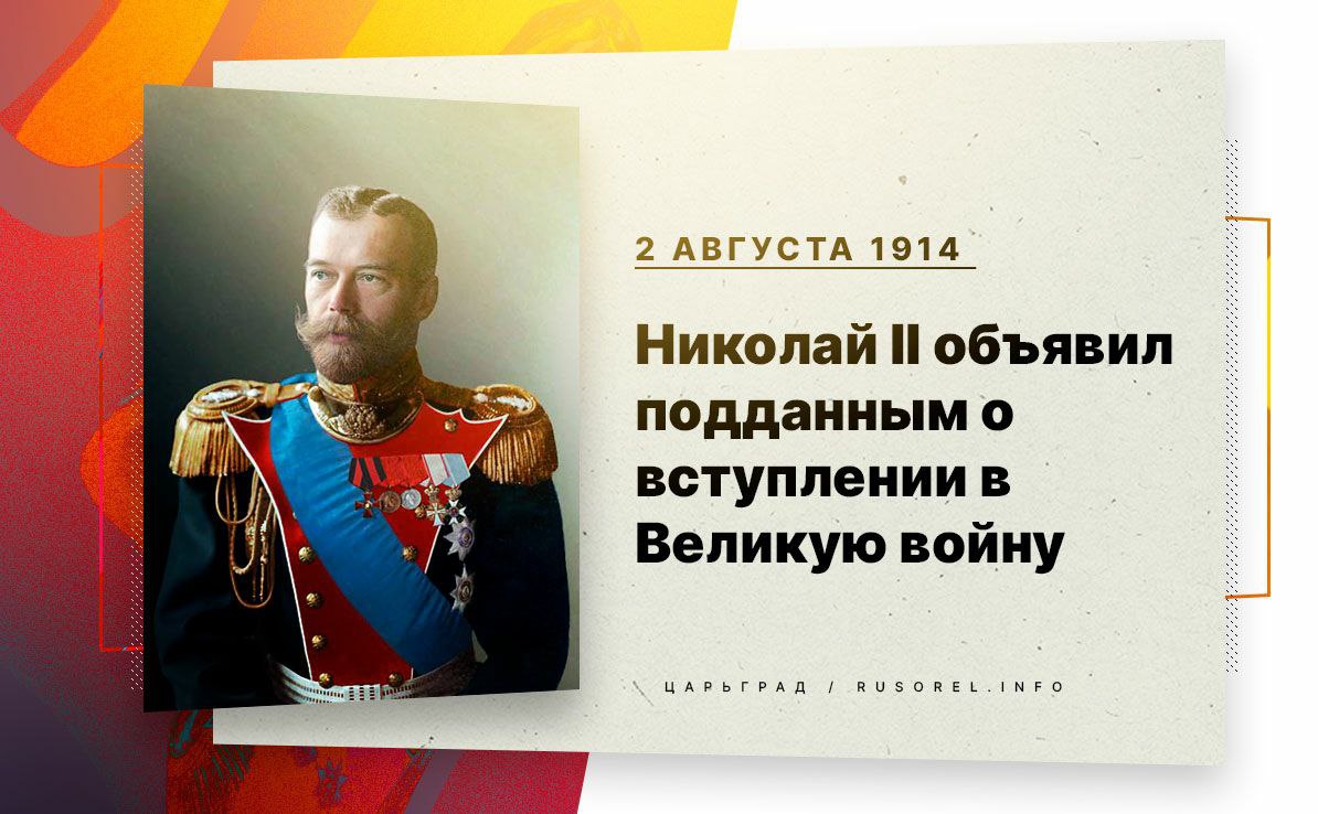 2 августа император Николай II объявил всем подданым о том, что империя вступает в войну с Германией. Повод — бомбардировка войсками Австро-Венгрии братской Сербии, покровителем которой всегда была Россия. Своё заявление император сделал на балконе Зимнего дворца, площадь перед которым была заполнена людьми. Они поддерживали решение монарха. Разгоряченная новостями толпа забросала камнями немецкое посольство, несколько зданий немецких фирм были сожжены.