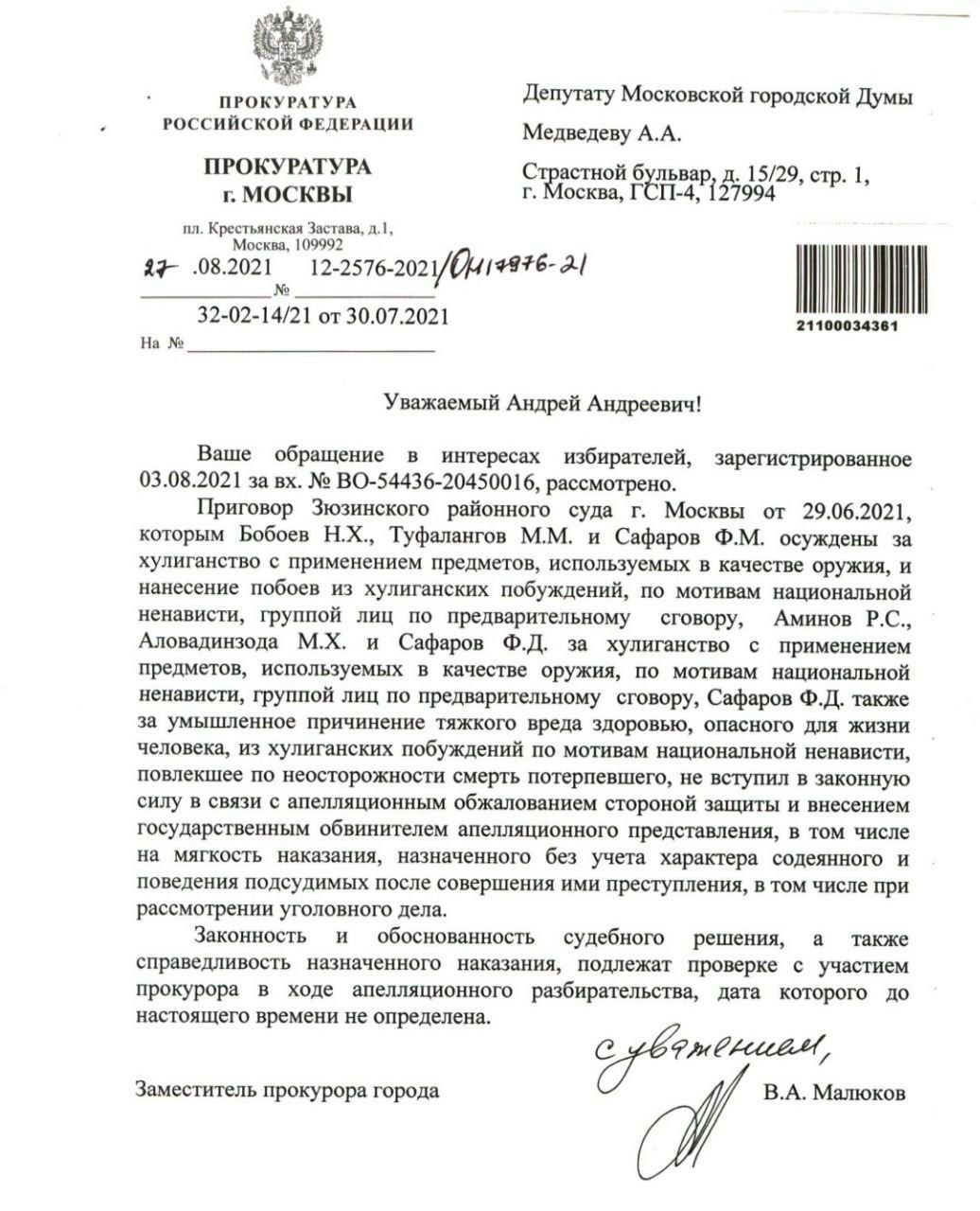 Это дело будет пересмотрено. Депутат Мосгордумы Андрей Медведев направил запрос в Прокуратуру, после которого гособвинитель внёс апелляционное представления из-за мягкости приговора по этому резонансному делу. Таджикская наркомафия решила, что они здесь могут купить всё, надеемся, что, как минимум, не в этот раз. У общества сформирован абсолютно четкий запрос на справедливость, все СМИ сейчас об этом пишут, народ требует справедливого наказания для этих этнических бандитов, то что мы видим сейчас - это насмешка над правосудием.