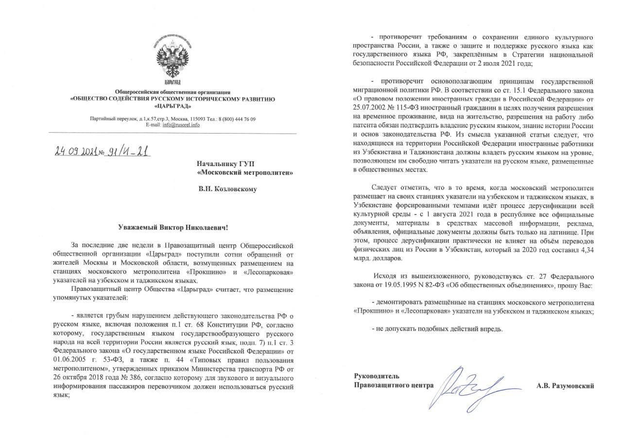 В дополнение к официальному обращению в адрес руководства ГУП «Московский метрополитен», Правозащитный центр Общества «Царьград» считает необходимым высказать позицию Общества по вопросу владения русским языком трудовыми мигрантами из стран Средней Азии и Закавказья.