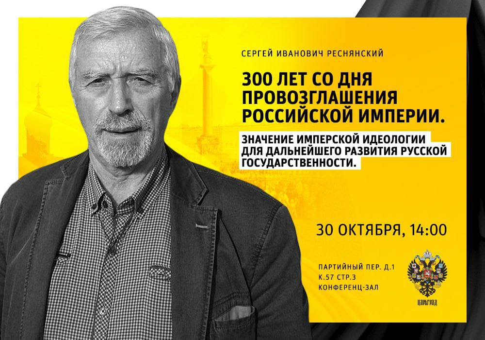 30 октября в конференц-зале Общества "Царьград" (Москва) состоится лекция на тему "300 лет со дня провозглашение Российской Империи. Значение имперской идеологии для дальнейшего развития русской государственности". Её прочтёт доктор исторических наук, профессор кафедры истории России Московского государственного областного университета (МГОУ) и РУДН Сергей Реснянский.