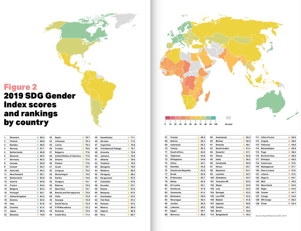 این گزارش که تاکید آن بر بررسی نابرابری جنسیتی را در حوزههای حق تحصیل، بهداشت، کار و دستمزد، خشونت جنسی، مشارکت سیاسی، محیط زیست و فقر است، میگوید که هیچ کشوری امتیاز «عالی» نمیگیرد. با اینحال همچون بسیاری از بررسیهای مشابه دیگر، نتیجه گرفت که وضعیت در کشورهای اسکاندیناوی بهتر از هر نقطه دیگر جهان است. با بررسی مجموع شاخصها و آمارها این گزارش اعلام کرد که دانمارک بهترین وضعیت را دارد و کشور چاد، بدترین وضعیت نابرابری جنسیتی را در میان کشورهای جهان دارد.