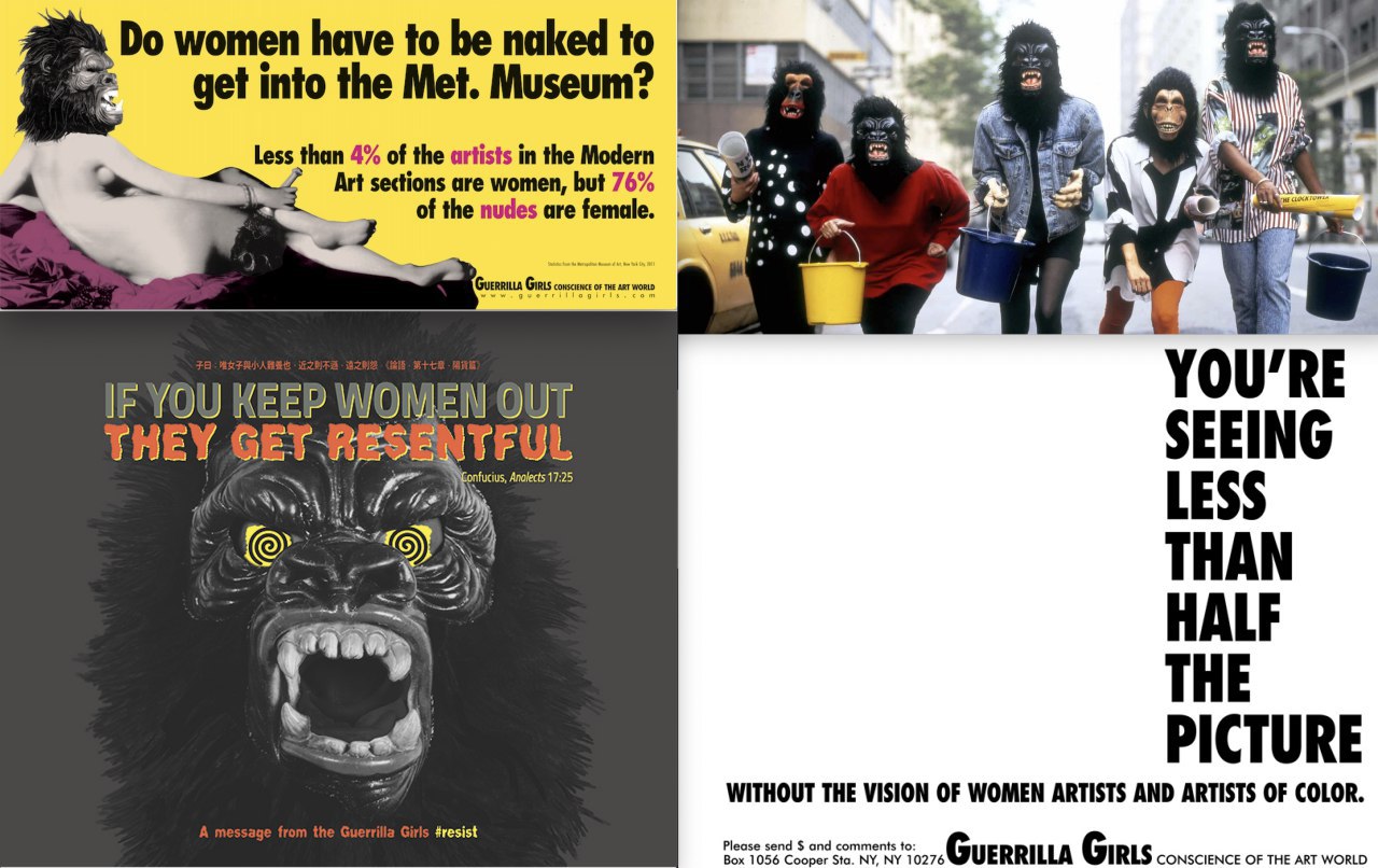 چند ماه پیش در موزه هیرشهورن شهر واشنگتن دیسی، نمایشگاهی از پوسترهای اعتراضی گروه «گوریلا گرلز» برگزار شد؛ گروهی که هیچکس نمیداند اعضای آن دقیقا چه کسانیاند و از سال ۱۹۷۸ در اعتراض به نابرابری شدید جنسیتی در عرصهی هنر شکل گرفت. آنها موزهها، گالریها، هنرگردانها، منتقدان هنری و فروشندگان مطرح آثار هنری را زیر ذرهبین برده و با آمار نشان میدهند که چطور تمام آنها درگیر «پرستش مرداناند» و دست در دست هم زنان هنرمند را نادیده میگیرند. اولین پوسترهای اعتراضی گروه شبانه در محلهی «سوهو» شهر نیویورک سر برآورد و خیلی زود به شکل آگهی بر بدنهی اتوبوسهای شهر نشست. اعضای گروه که تعدادشان به گفتهی خودشان به ۵۵نفر میرسد، هر زمان که جلوی نمایشگاه مردانهی تازهای تجمع اعتراضی داشت، ماسکهای به شکل صورت گوریل به صورت میزدند و کسی نمیداند پشت این ماسکها چه کسانیاند.