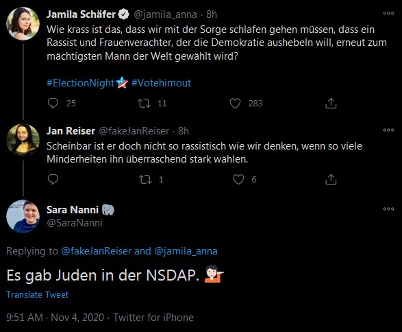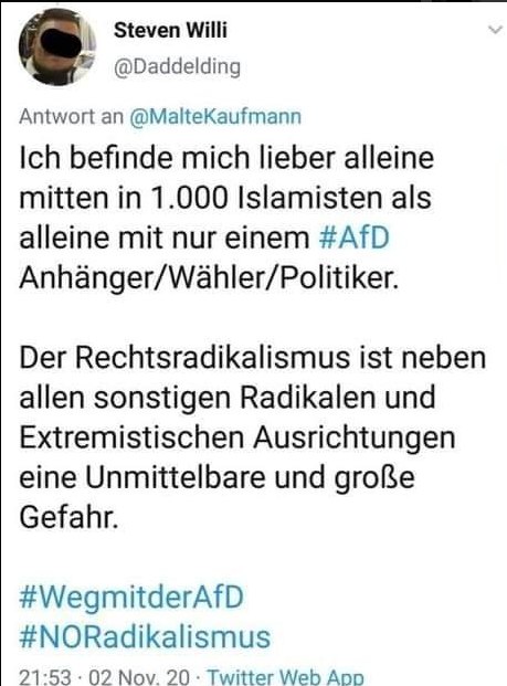 ​​Linke sind verwirrt. Exikubaner, die vor dem sozialistischen Terror in der Heimat flüchteten, wählen keinen Sozialismus-Appeaser. Schwarze, die in den vergangenen 4 Jahren einen Job gefunden haben, wählen niemanden, der sie am Tropf des Sozialamts fesseln will. Die Minderheiten emanzipieren sich von dem Joch der Linken und immer mehr von ihnen wollen sich nicht mehr zur ideologischen Hure und Wahlvieh für Kulturmarxisten degradieren lassen. So manch einem schmeckt das so dermaßen wenig, dass seine Synapsen natürlich wieder irgendwelche Nazi-Vergleiche hervorbringen lassen.