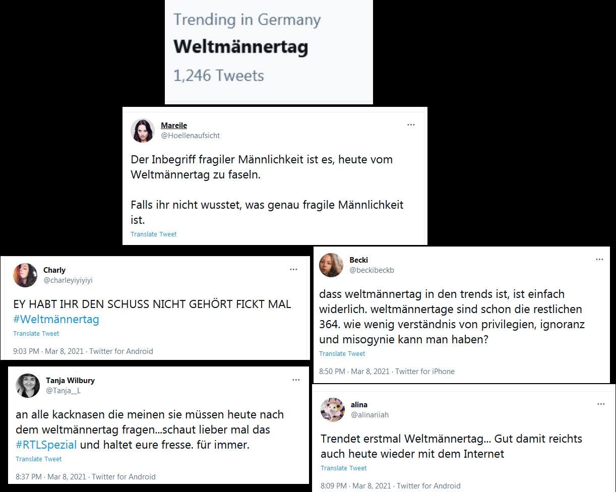Spoiler: "Weltmännertag" ist nun auf Platz 1 der Trends und besteht zu 2% aus Trollen, die nach einem Weltmännertag fragen und zu 98% aus getriggerten Wohlstandsschlunzen, die sich darüber aufregen, dass "Weltmännertag" trendet