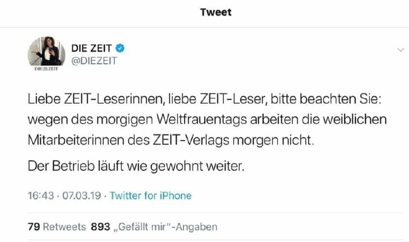 ​​Der Inbegriff fragiler Weiblichkeit ist es, wenn eine Handvoll Internet-Trolle "Weltmännertag" auf Twitter trenden lassen, die supertaffen Powerfemunzen dadurch vollkommen durchgetriggert sind und nun Twitter vollmenstruieren, wie "Weltmännertag" trenden kann. Dabei merken sie nicht, dass mit jeder weiteren Erwähnung der Begriff weiter und weiter nach oben in den Trends klettert.