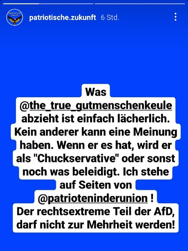 Keule-Übersetzer: "Nachdem ich kilometerweise Lörres bei Identitären und bei Kameradschaften verschlungen habe, woraus dann 3 Kinder von 4 Vätern resultierten und ich durch mein Borderline-Verhalten meinen Ruf ruinierte, habe ich politisches Asyl im Wokeness-Lager gesucht. Dort jedoch habe ich es nur mit Menners der Sorte "Geheimratsecken-Klaus" zu tun, der als Geldsklave meinen Traum vom privilegierten Lotterleben finanzieren will. Jetzt gibt es in meiner Welt nur noch drei Kategorien von Menners: Toxisch-maskuline Kaggnazis, die mich im Nachgang natürlich alle vergewaltigt haben - Rechte Incels, denn insgeheim wollen sie mich alle ficken und finden mein Verhalten nur doof, weil sie nicht dürfen - und den linksliberalen Klaus, der an meinen Füßen riechen will. Deswegen, und nicht etwa weil der Dachschaden in meinem Kopf nur bestimmte Sorten von Mann wahrnimmt, will ich jetzt eine Frau haben."