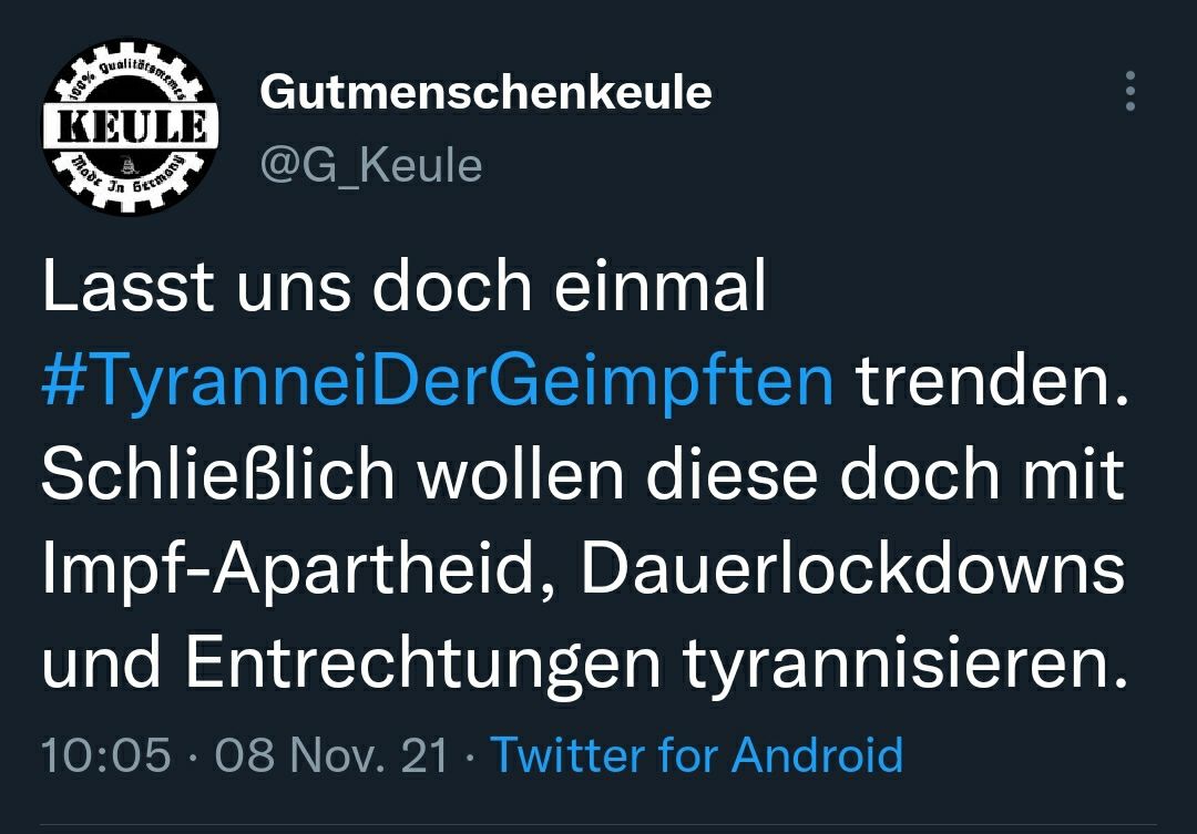 Zur Zeit trendet #TyranneiDerUngeimpften und es wird Täter-Opfer-Umkehr betrieben. Lasst uns Impfsuchtis mit einem Hashtag triggern. :3