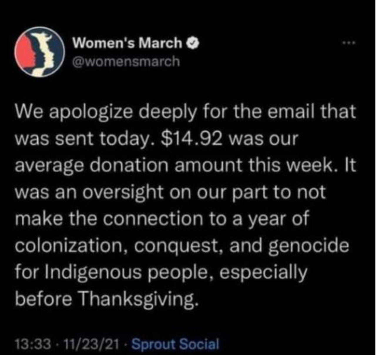 Ganz davon abgesehen: Eine einflussreiche Organisation, die von sich behauptet, für alle Frauen der USA zu sprechen, sammelt von ihren Unterstützerinnen nur 14,92 $ ein. Das muss dieses solidarische, soziale und empathische Geschlecht sein, unter dessen Regie all das von bösen, egoistischen, weißen cis-Männern verursachte Elend beseitigt wird.