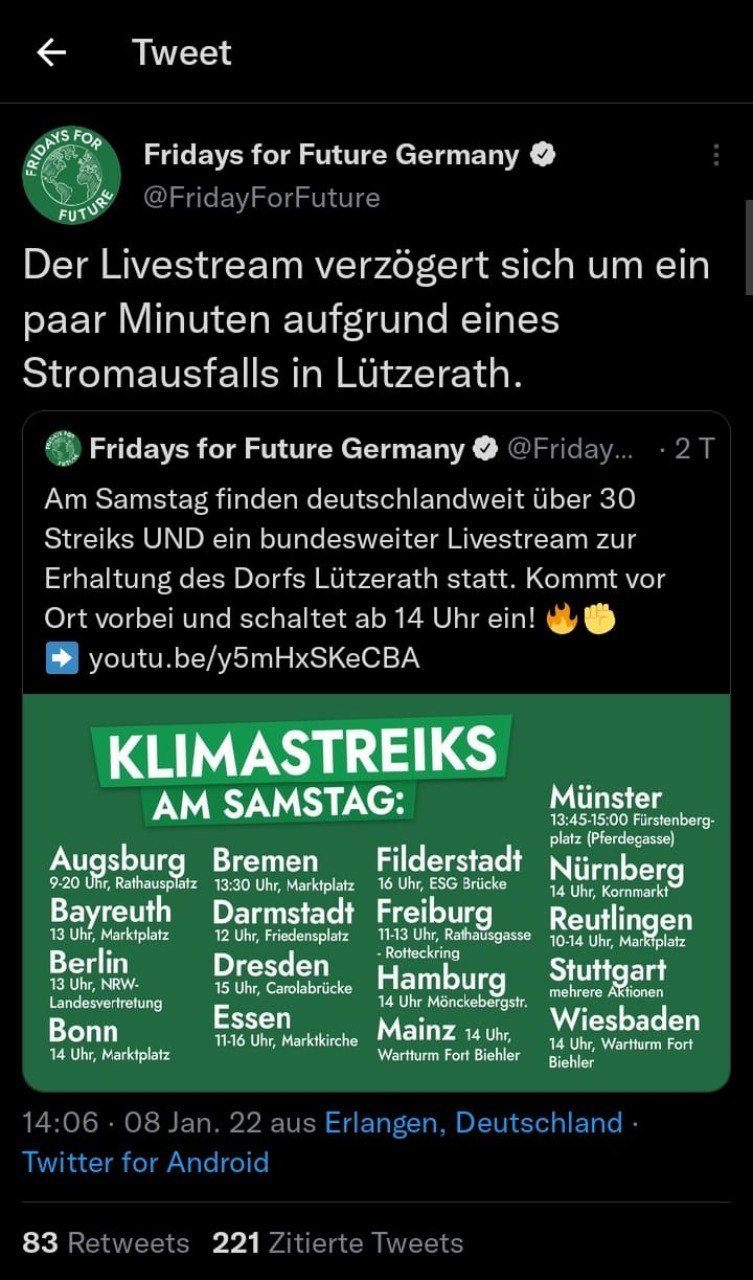 ​​Wohlstandsverblödete Klimahüpfer realisieren, dass der Strom nicht aus der Steckdose kommt.