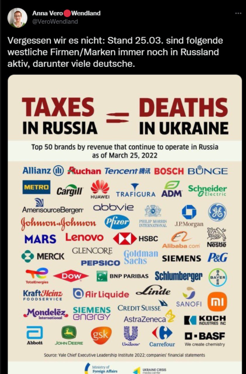 Almans in der Zwickmühle: Gratismutig wollen sie in sozialen Netzwerken rumtönen, dass sie alle Unternehmen boykottieren, die weiterhin Geschäfte mit dem bösen Putin machen. Jedoch gehören Pfizer, Johnson&Johnson und AstraZeneca ebenfalls zu diesen bösen Unternehmen. Also muss der Alman zwangsläufig ein verschwörungsschwurbelnder Impfverweigerer werden, um "Haltung" zu zeigen.