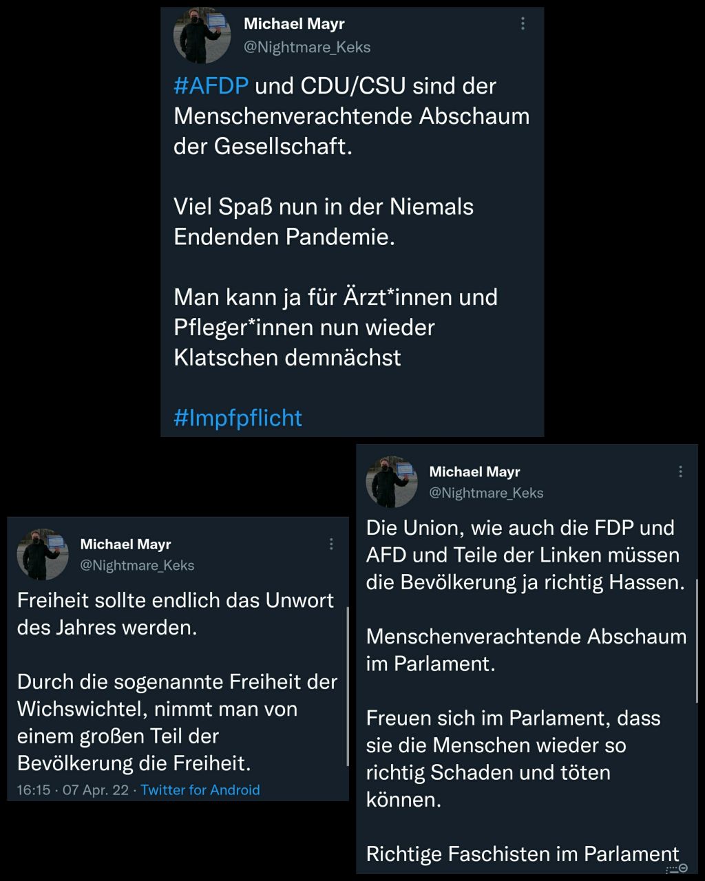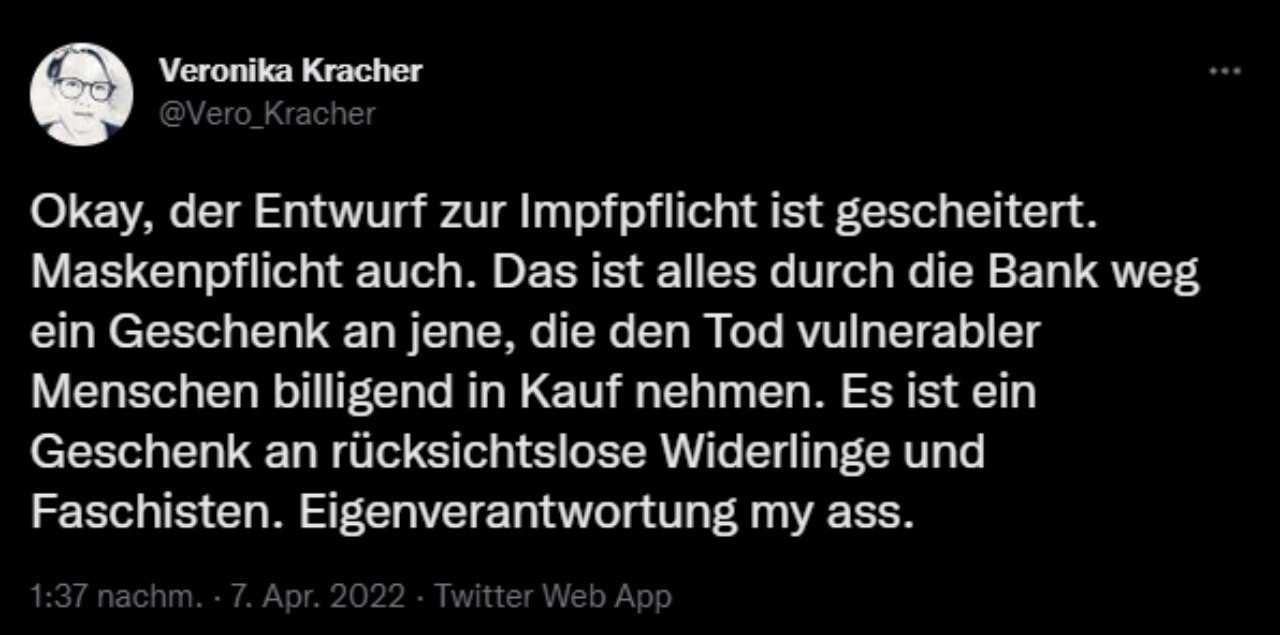 Der Alman sehnt sich jetzt nach einem Lockdown als Rache dafür, dass sie ihre geliebte Genspritze nicht in unser aller Arme reinrammen lassen können. Es geht dem Alman nicht um unsere Gesundheit, sondern um niedere Machtfantasien.