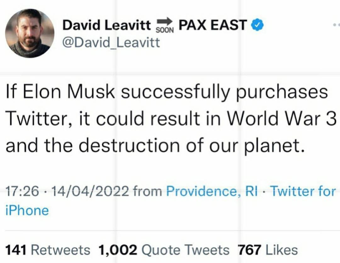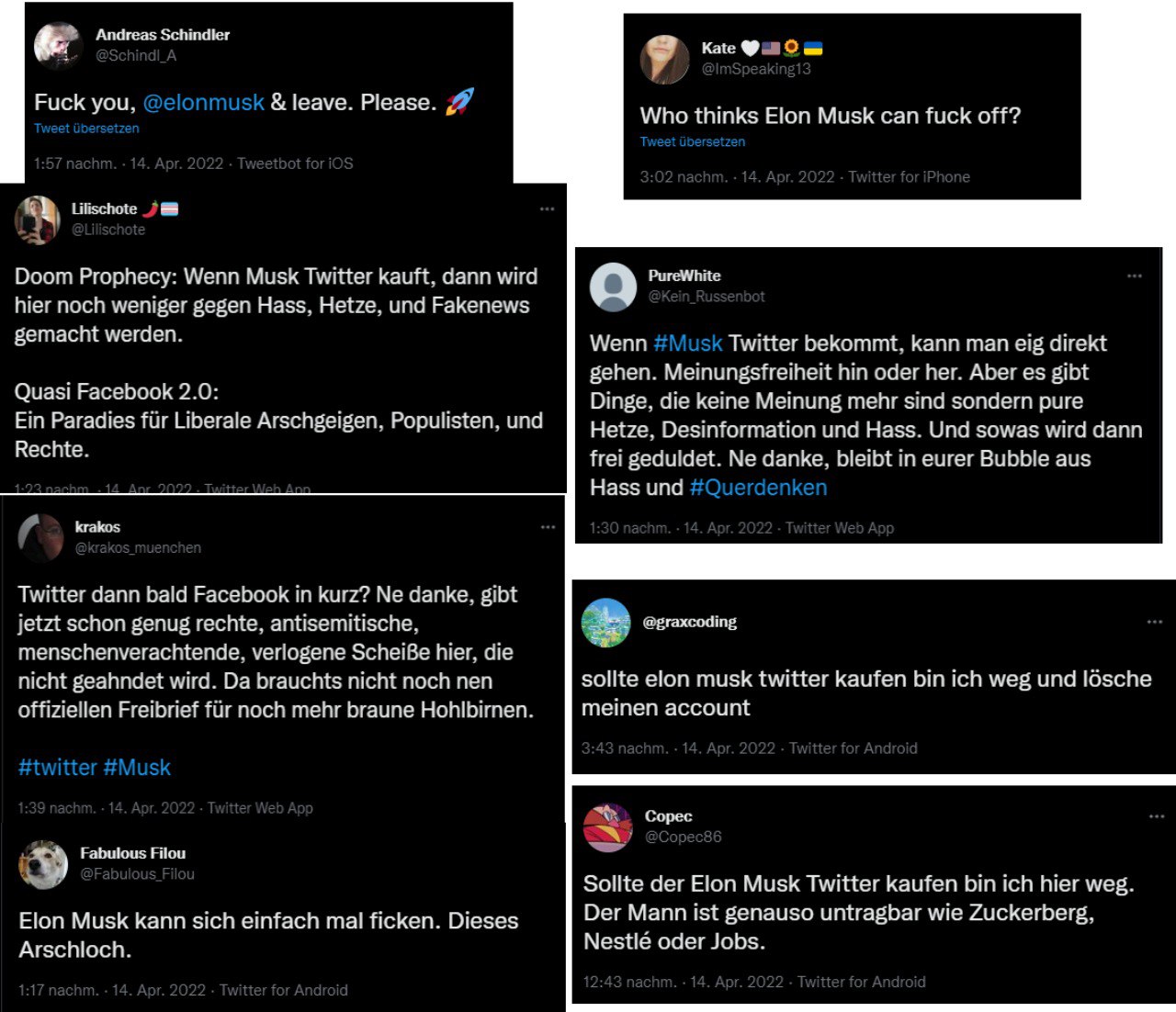 Linkes Arschbluten nach der Meldung, dass Elon Musk Twitter aufkaufen möchte. Wer schützt unsere linken Pussys dann vor - oh Schreck - Andersdenkenden?