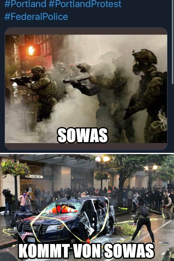 "Bawww wir wollen doch nur Geschäfte plündern, Autos anzünden und weiße Passanten ins Koma prügeln. Und Trump schickt die Bundespolizei, um uns daran zu hindern! Faschismus!!!"