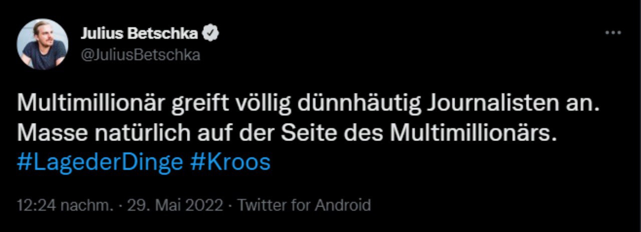 ​​Toni Kroos pöbelt GEZ-Journalisten an. Natürlich ist die Mehrheit auf der Seite desjenigen, dessen Arbeitgeber nur ein zehntel des Jahresbudgets des Regierungspropaganda-Apparats besitzt und den der Durchschnittsbürger nicht zwangsfinanzieren muss.