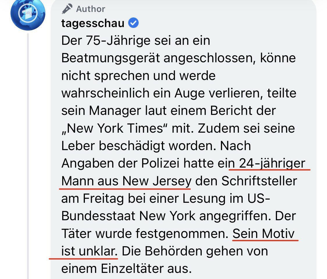 Mann(tm) sticht auf Schriftsteller ein, auf den seit 1989 eine Todesfatwa angesetzt ist. Das Motiv ist unklar(tm).
