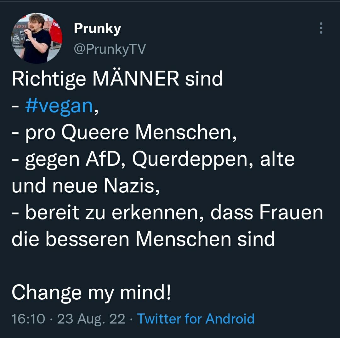 Jetzt stellt euch mal die umgekehrte Situation vor: Dummes Almanweib und ihr kastrierter Schoßhund nehmen Mutombo auf. Almanweib verliebt sich in Mutombo und schmeißt ihren Julian-Malte aus der Wohnung. Septum-Sophie und Pronomen-Paula wären verzückt und würden ganz viele Liebende-Reaktionen rausschmeißen. Und natürlich würden sie jeden als frauenhassenden Rassisten-Incel beschimpfen, der diese Lovestory nicht genauso abfeiert.