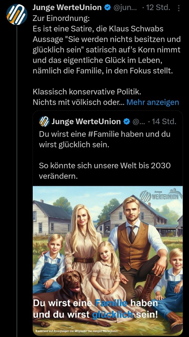 Derweil rechtfertigt sich die WerteUnion auf Twitter und bettelt bei Wokelümmeln um Entschuldigung, weil ein Beitrag deren Fühlis verletzt hat.