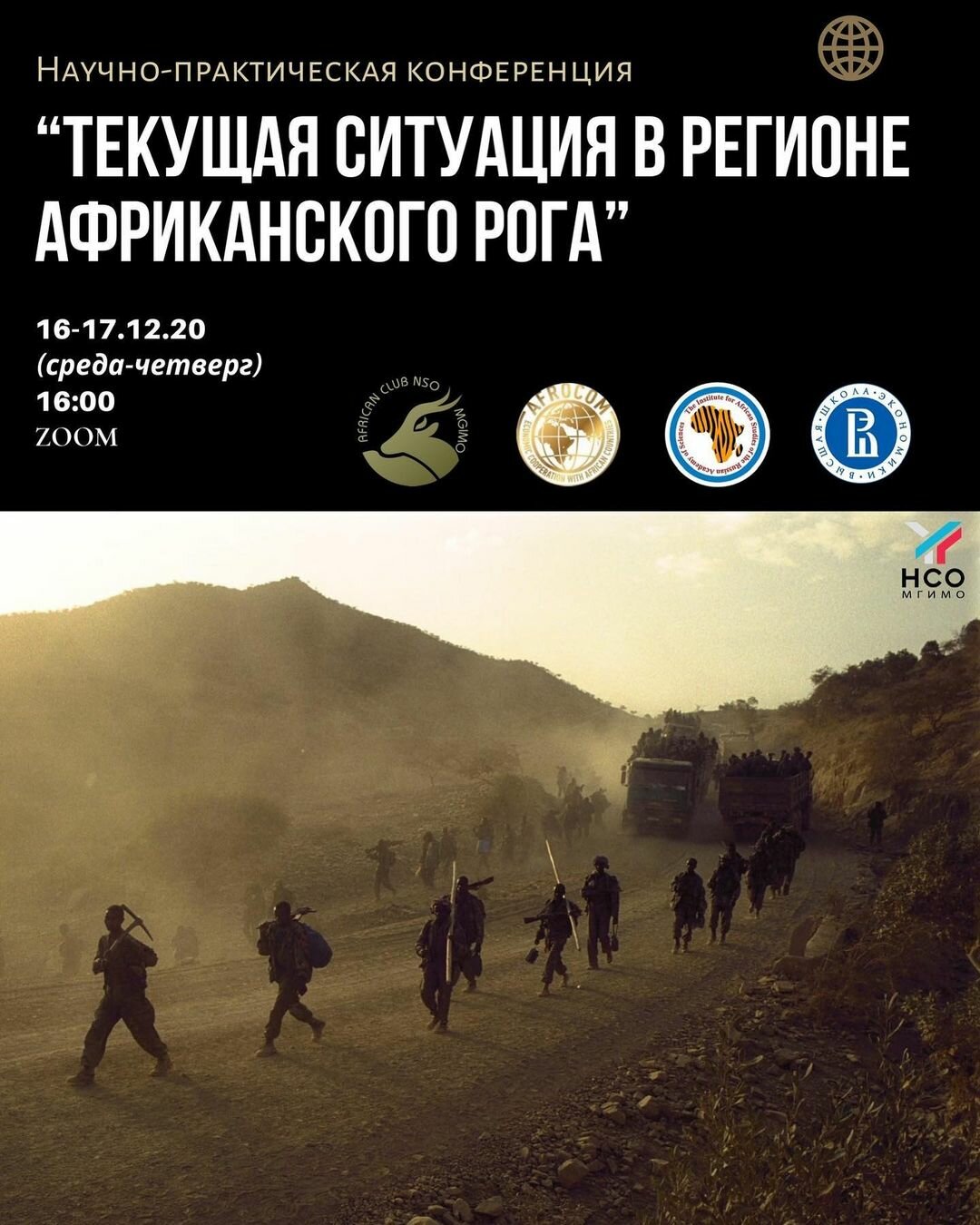 Координационный комитет по экономическому сотрудничеству со странами Африки (АФРОКОМ) совместно с Институтом Африки РАН, Центром изучения Африки НИУ ВШЭ, Базовой кафедрой Института востоковедения РАН в НИУ ВШЭ, а также Африканский клуб НСО МГИМО 16-17 декабря 2020 года проводят конференцию на платформе ZOOM. По результатам конференции будет опубликован сборник научных статей.