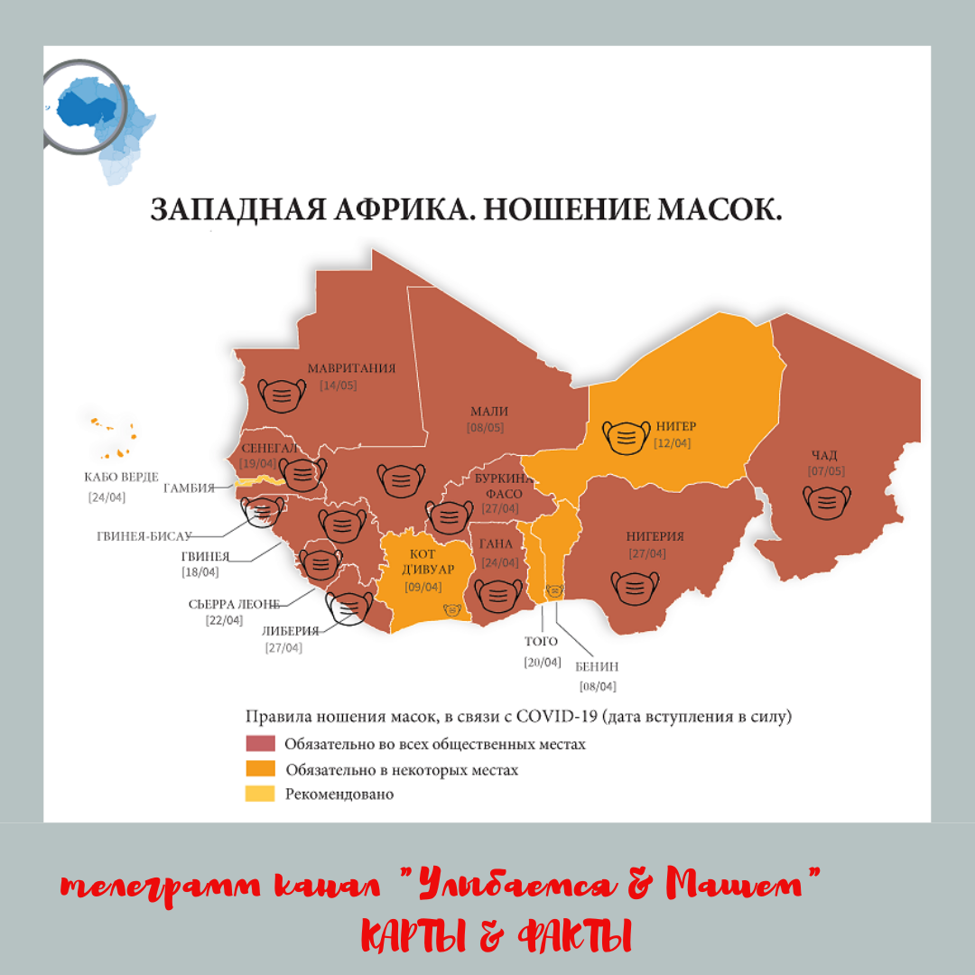 Бенин был первой африканской страной, которая 8 апреля ввела политику «санитарного кордона», которая предусматривала обязательное ношение масок в общественных местах. Кот-д'Ивуар обязывает к ношению масок в торговых центрах и супермаркетах. Нигерия сделала обязательным использование масок в столице (Лагос). Мегаполис быстро стал центром моды для масок из африканской ткани. В канале было несколько постов на эту тему (см. 1, 2, 3, 4, 5, 6).
