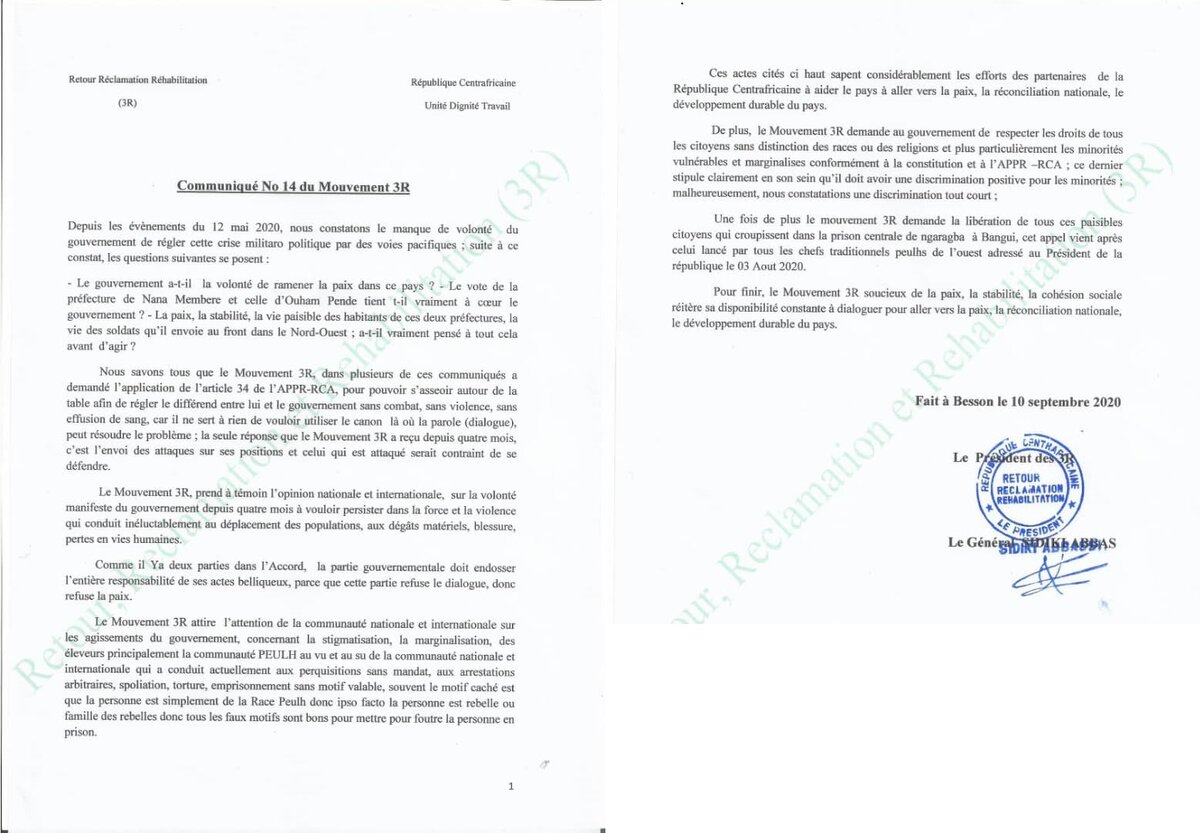 Свежее коммюнике от вооруженной группировки 3R (см. фото) стилистически все так же полно пафоса и праведного гнева. Несмотря на третий месяц вооруженного давления со стороны миротворческих сил, уничтожения ряда баз группировки и пленение ее сторонников, 3R все-таки сохраняет организационное единство, и свое влияние на северо-западе ЦАР. И периодически огрызается, не только посредством медийных акций (коммюнике), но и в формате вооруженных провокаций против контингента ООН MINUSCA и войск FACA.